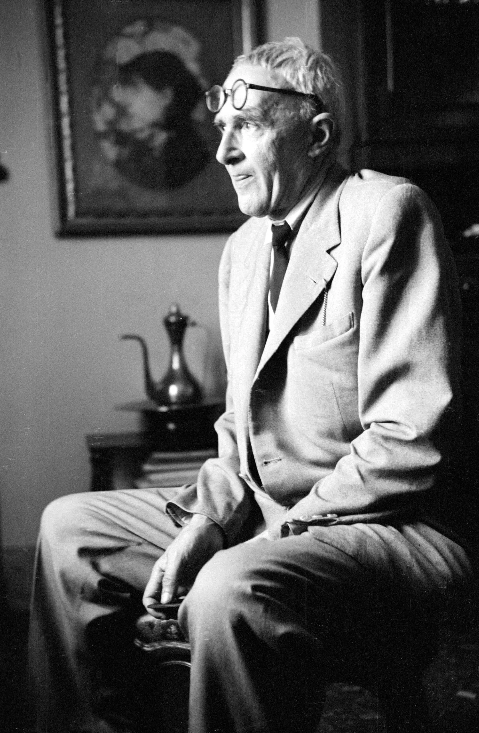 Black and white photograph of an elderly white man in a light suit and round glasses, seated in three-quarter profile, looking to the left