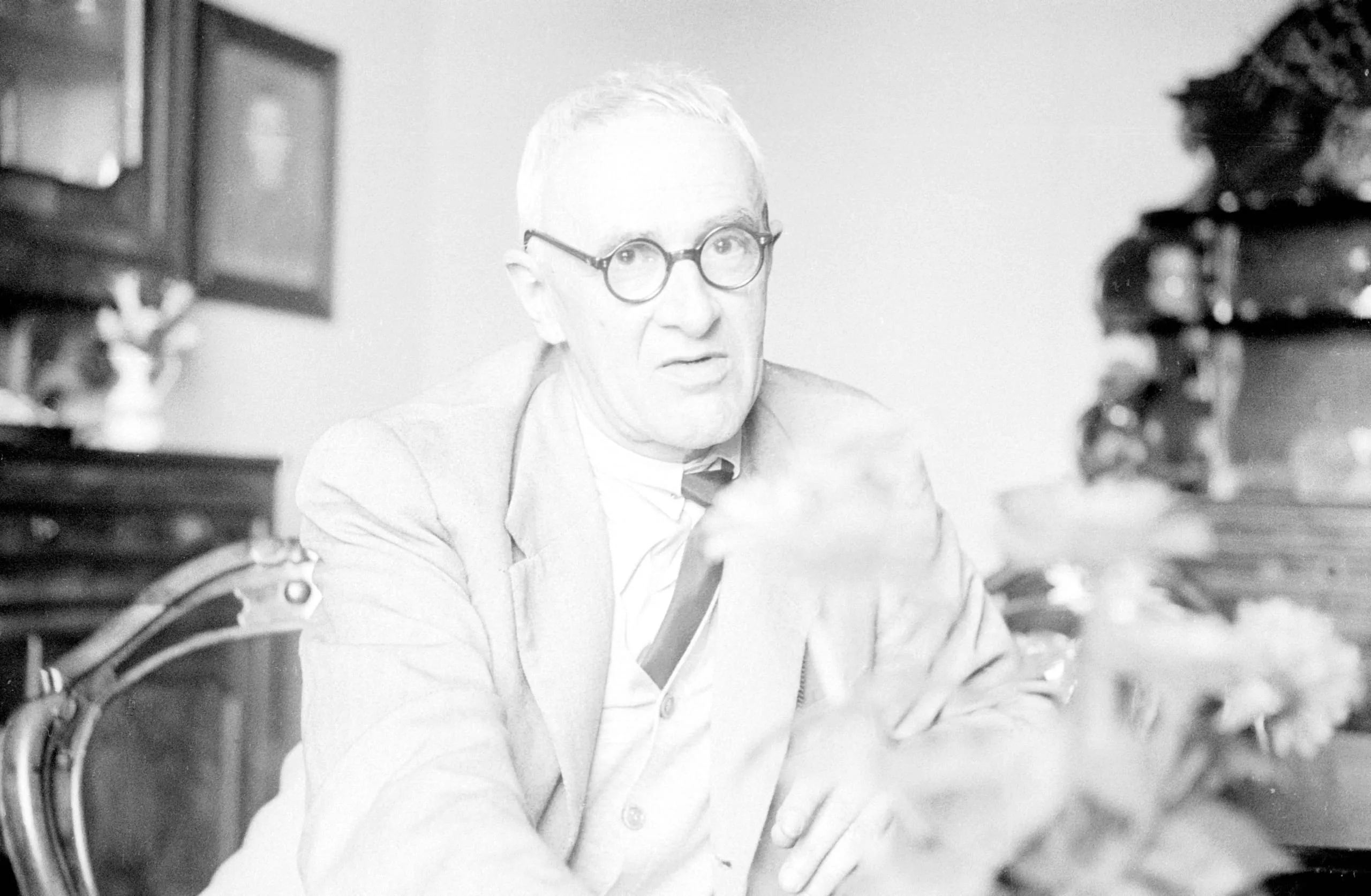 Black and white photograph of a white man in a light suit and round eyeglasses, seated and leaning forward with hands raised mid-gesture, interior setting