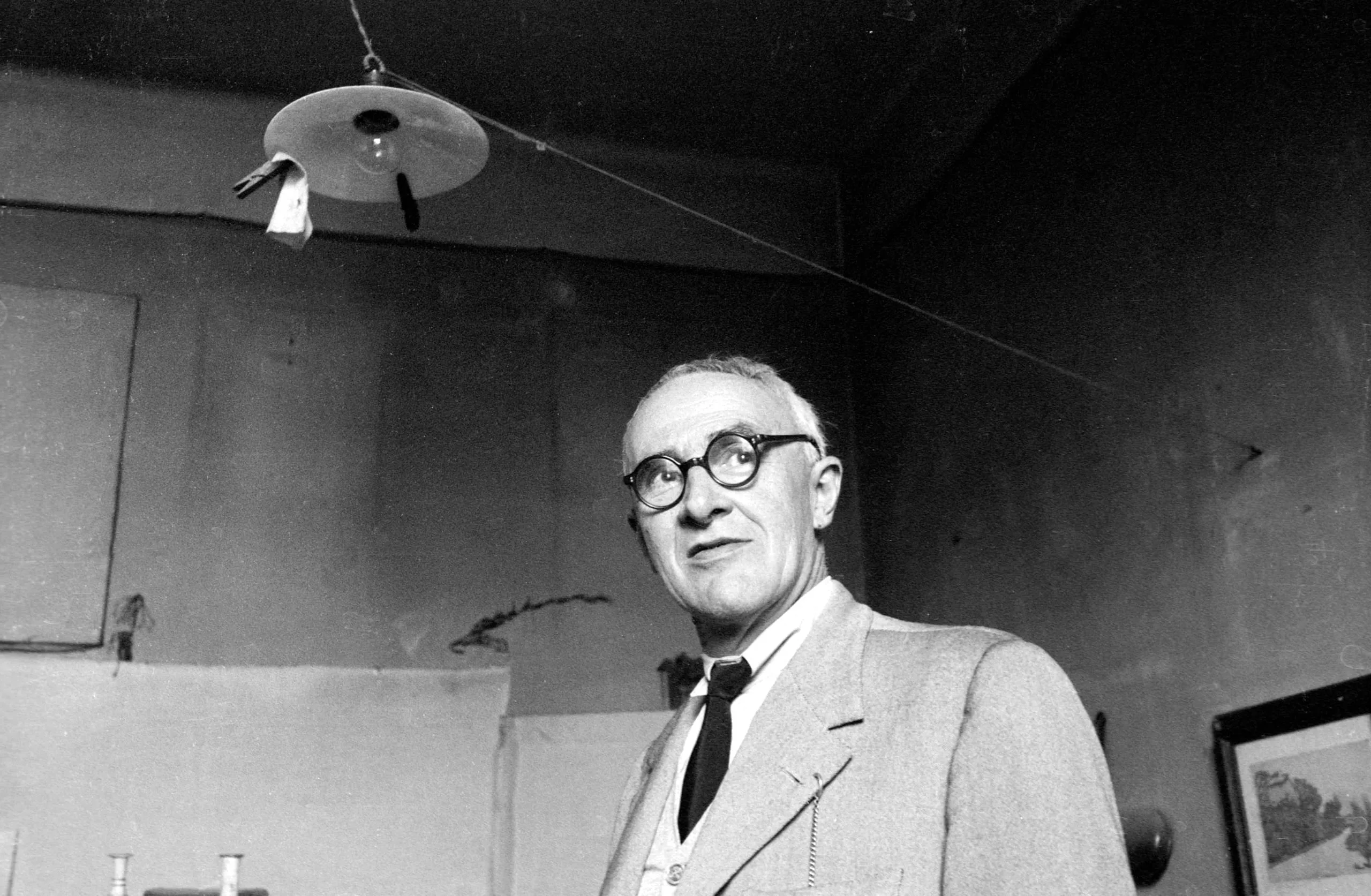 Black and white photograph of a white man from the waist up, wearing round glasses, a suit, and dark tie, looking up and to the left in a dimly lit room