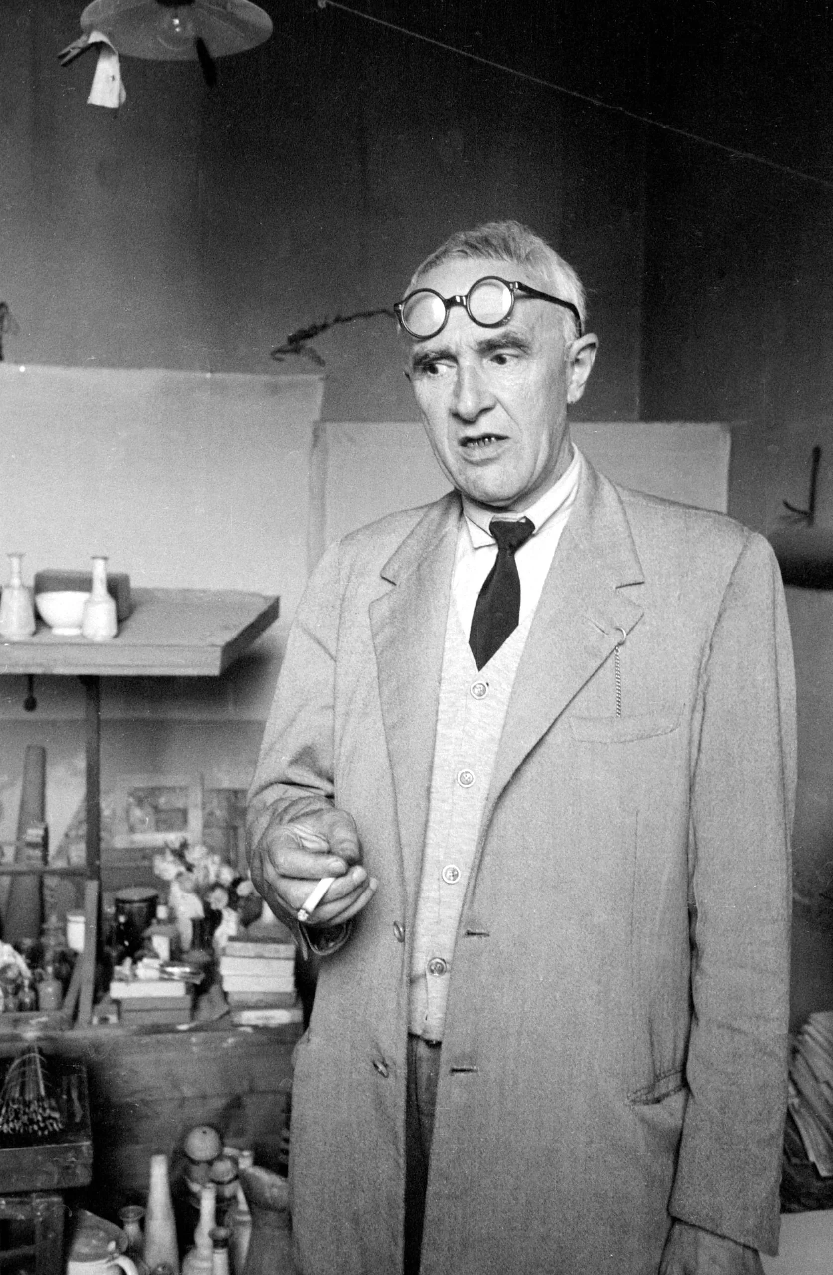 Black and white photograph, an older white man in a long coat and round glasses, holding a cigarette, standing in a cluttered studio