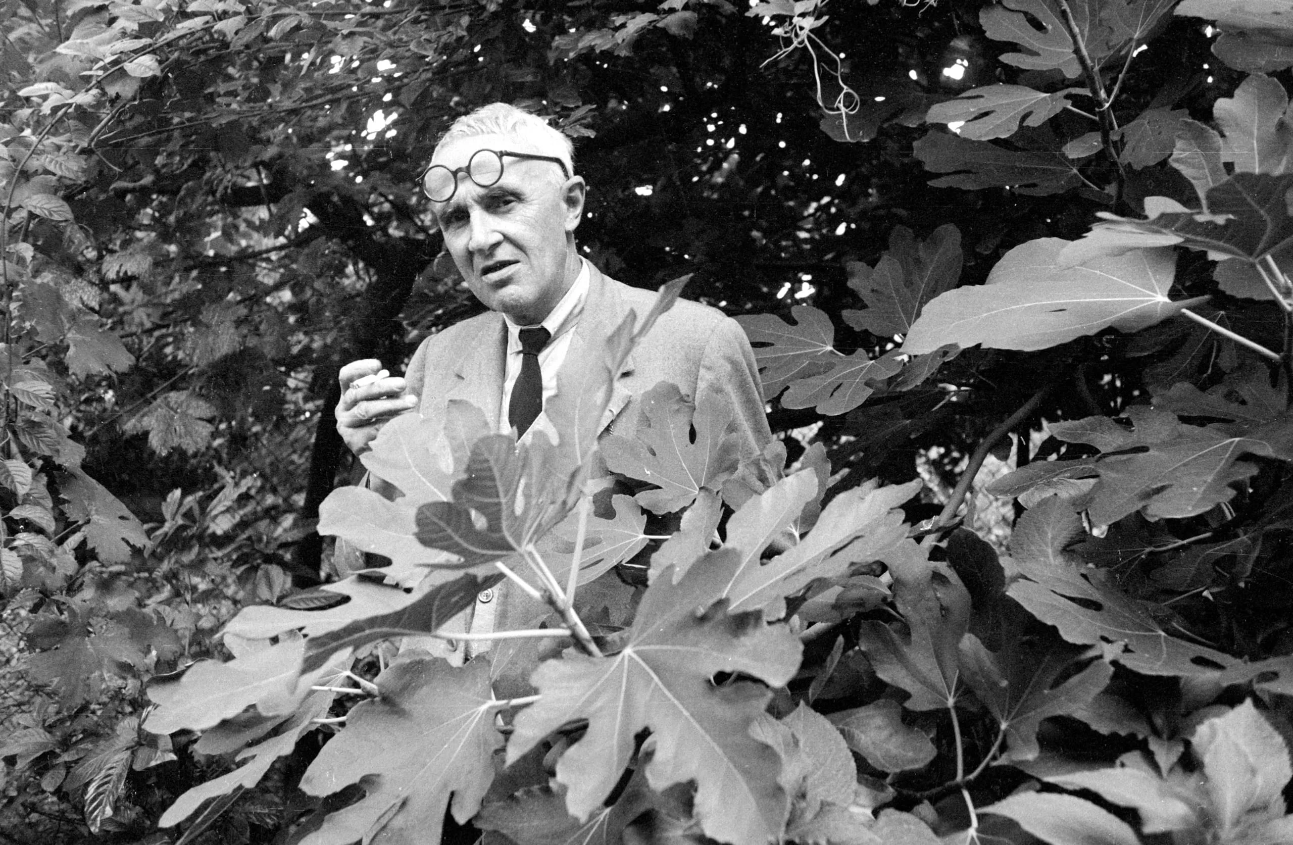 Black and white photograph of a white man in a suit and tie, glasses pushed up on his forehead, standing among large lobed leaves and holding a small round object