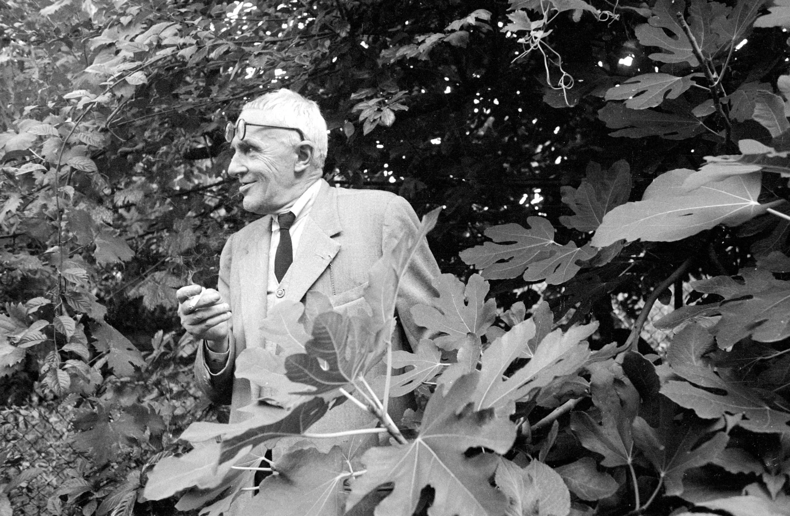 Black and white photograph of an older white man in a light suit and dark tie, half-obscured by large-leafed foliage, looking to his left with lips slightly parted