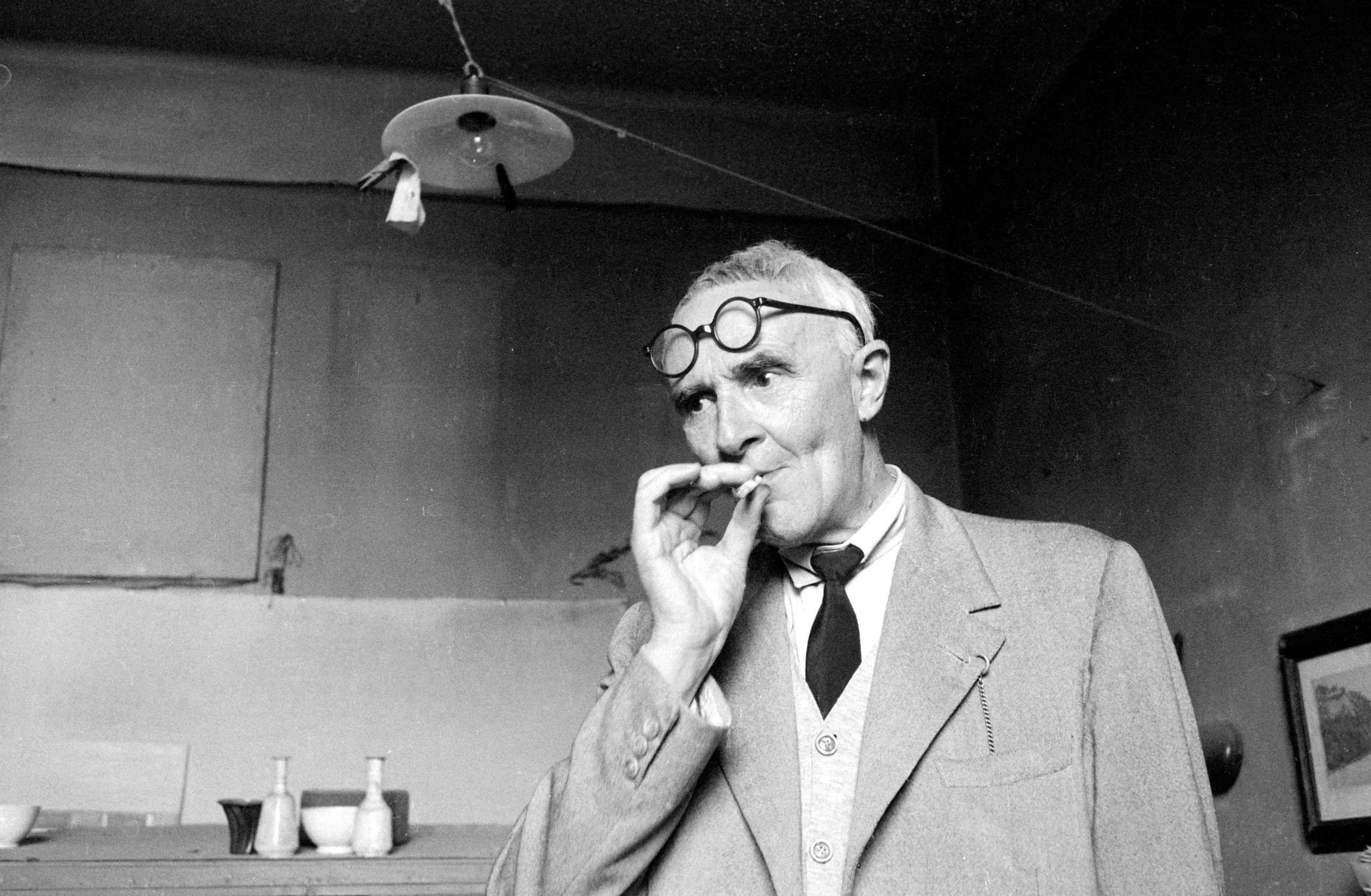 Black and white photograph of an older white man in a suit and round wire-framed glasses, raising a cigarette to his lips, in a sparse interior