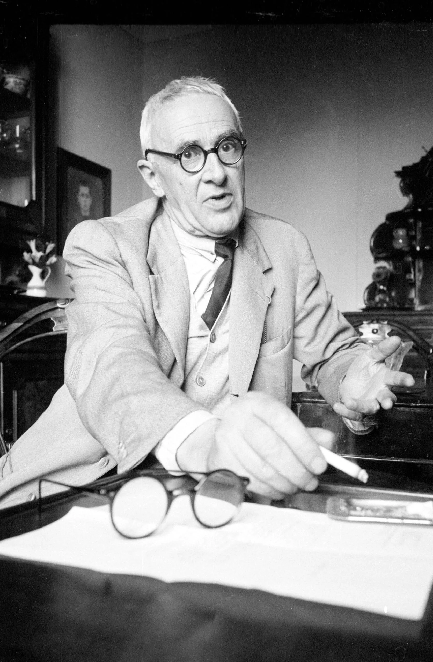 Black and white photograph of a white man with short gray hair and round glasses seated at a desk, leaning forward with one hand raised, holding a cigarette in the other