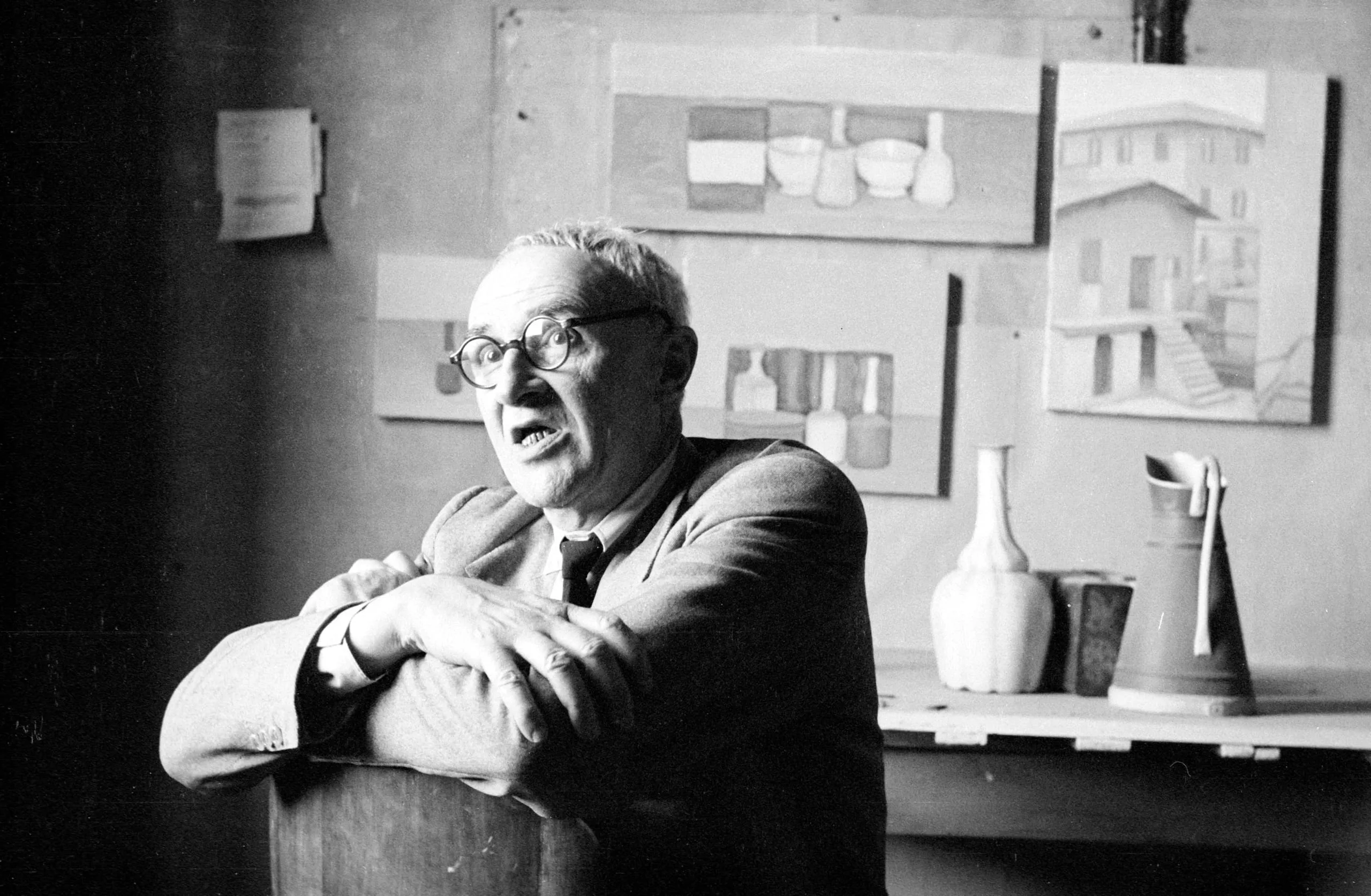 Black and white photograph of a white man in glasses and a blazer, leaning on the back of a chair with mouth open, paintings and ceramic vessels visible behind him
