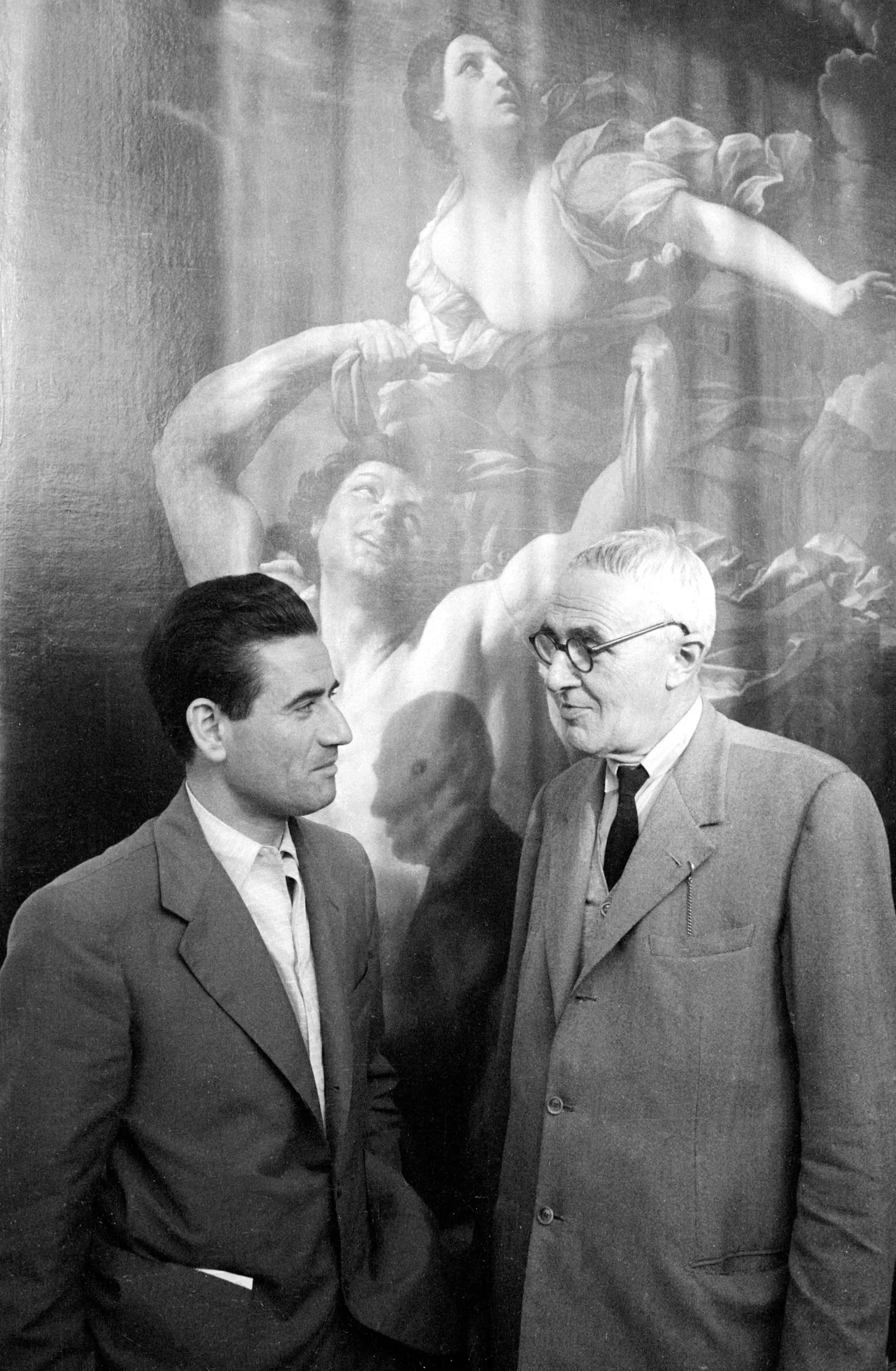 Black and white photograph of two men in suits standing before a large Baroque-style painting with dramatic figures