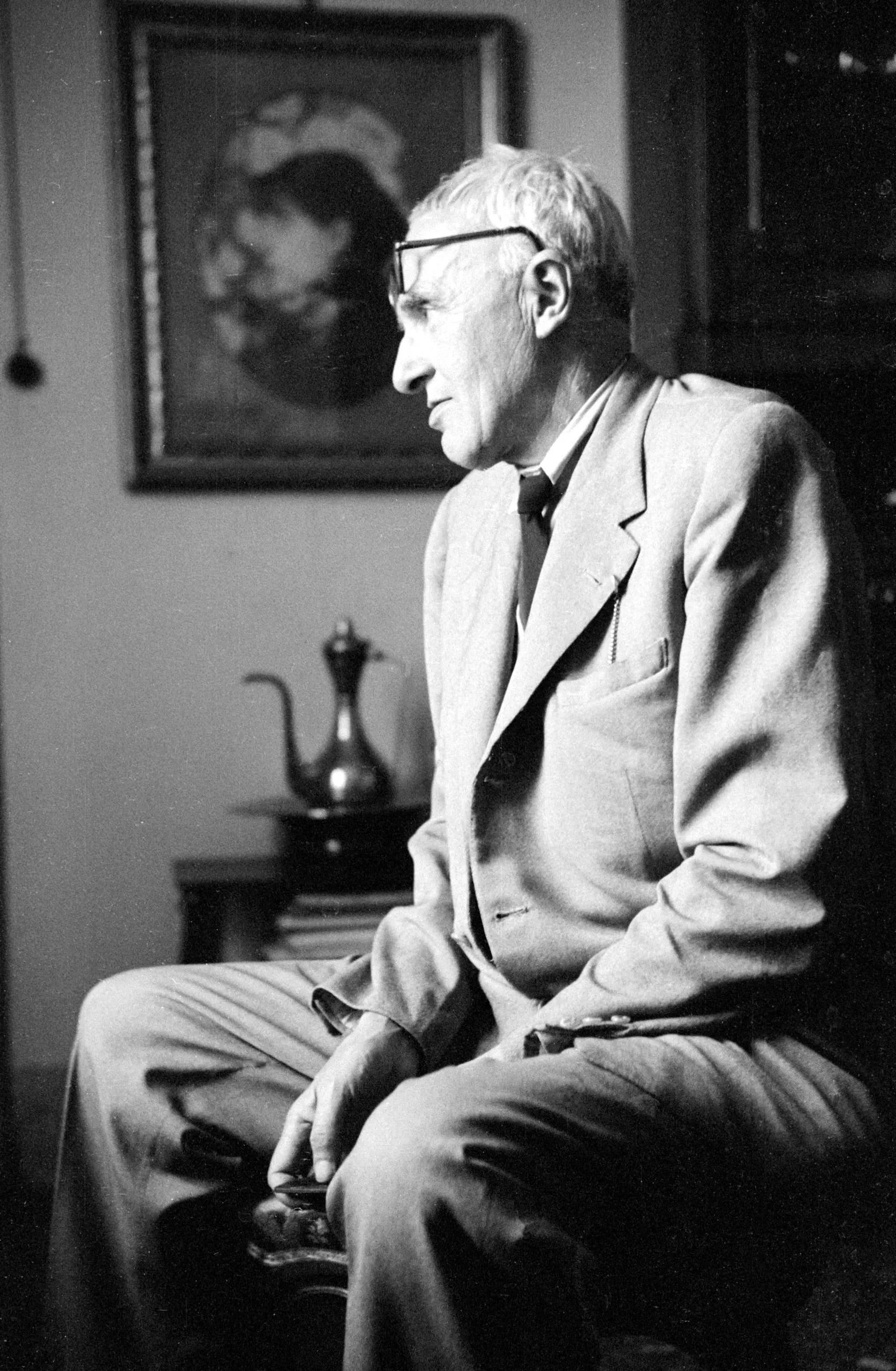 Black and white photograph, elderly man seated in left profile, wearing suit and glasses, with a framed painting and metal ewer visible behind him