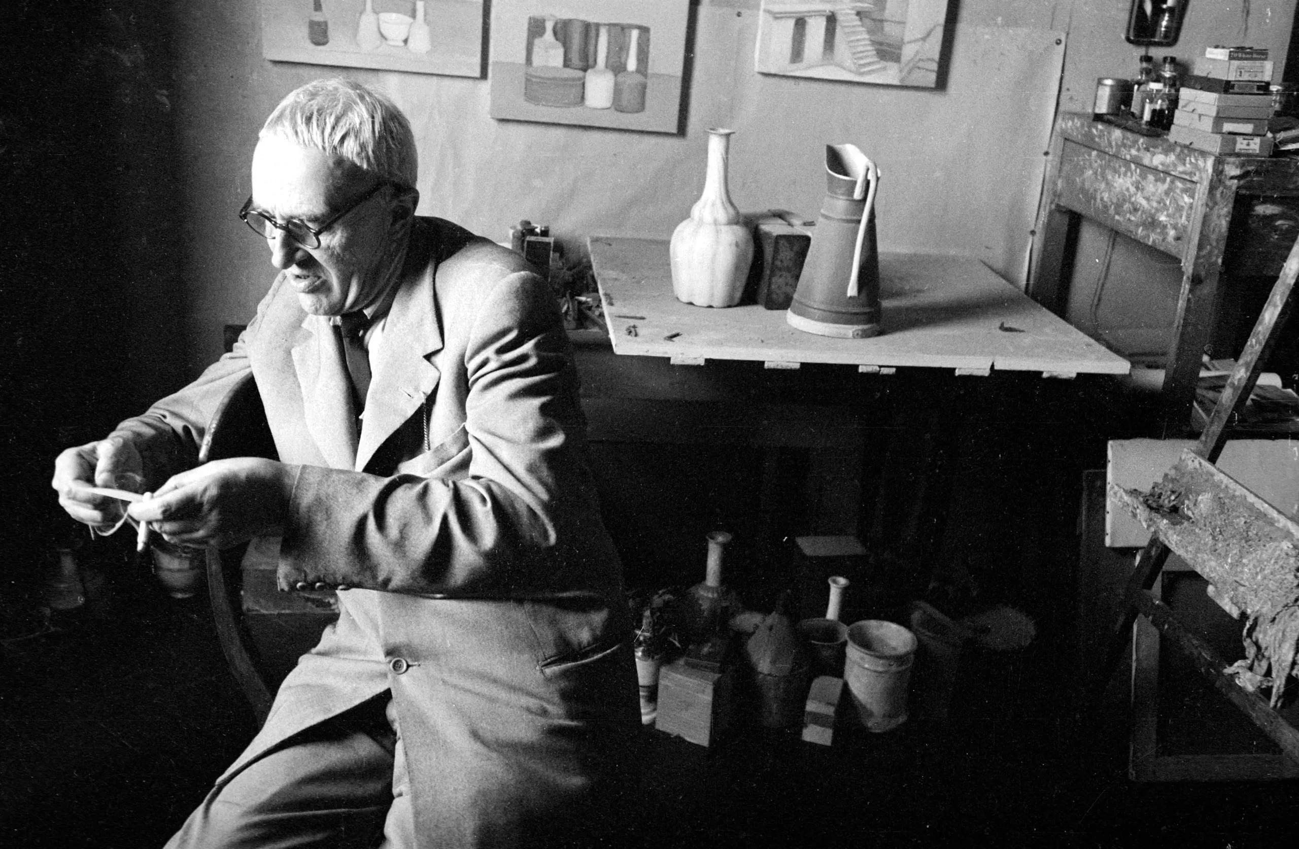 Black and white photograph of a pale-haired older man in a suit seated in an artist's studio, looking down at his hands, with ceramic vessels and paintings visible behind him