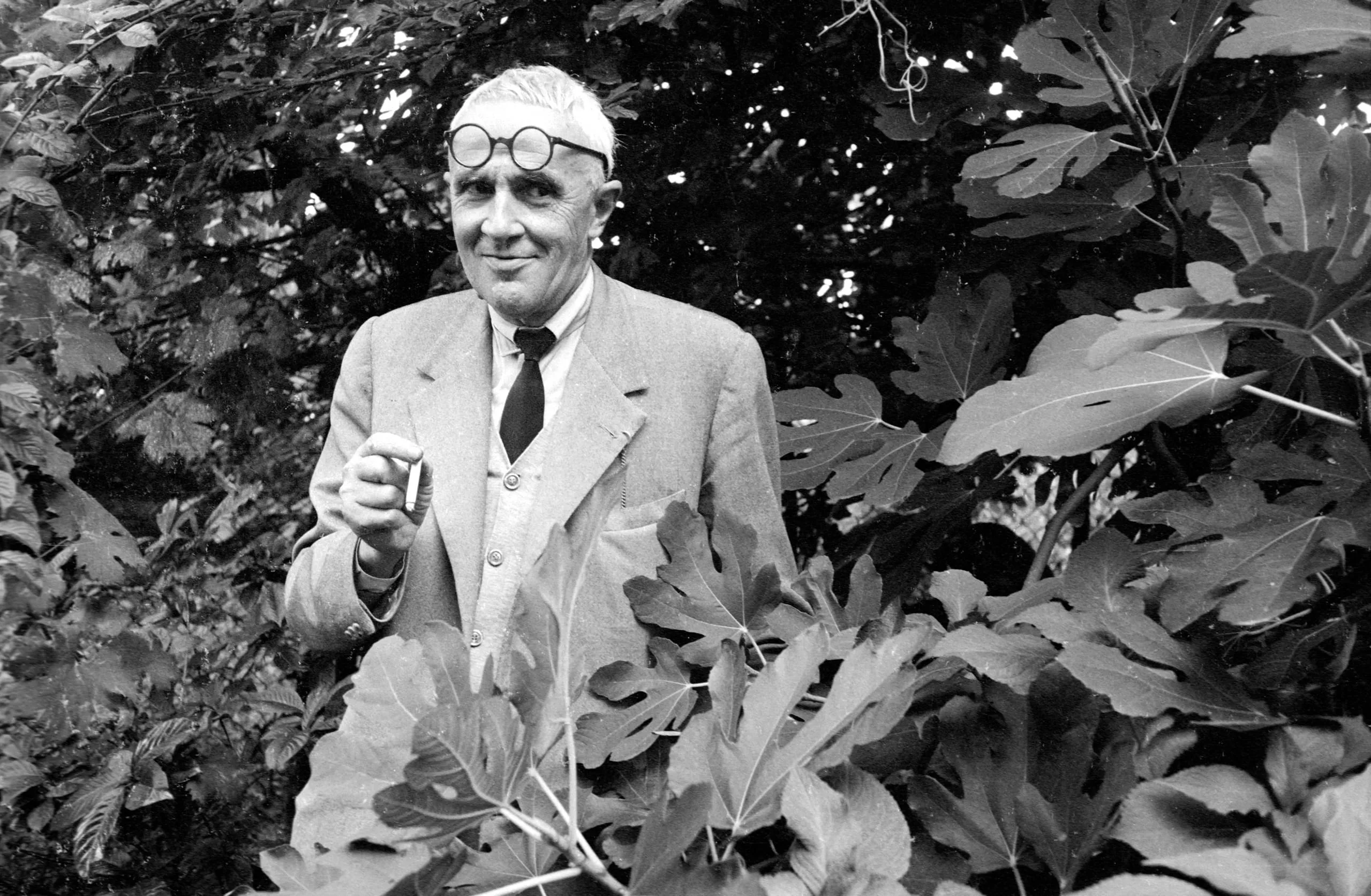 Black and white photograph of an older white man in a suit and round glasses, holding a cigar, standing among large-leafed garden shrubs