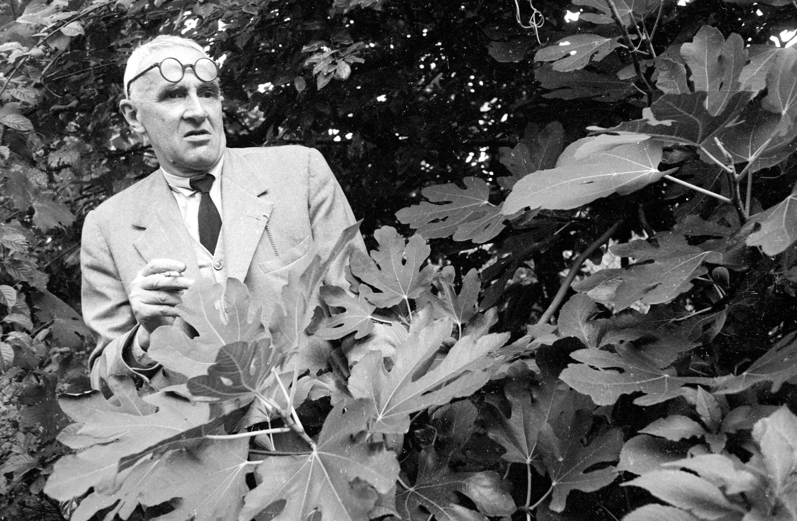 Black and white photograph of a white man in a suit and cap, waist-up, surrounded by large lobed leaves, looking upward to his left