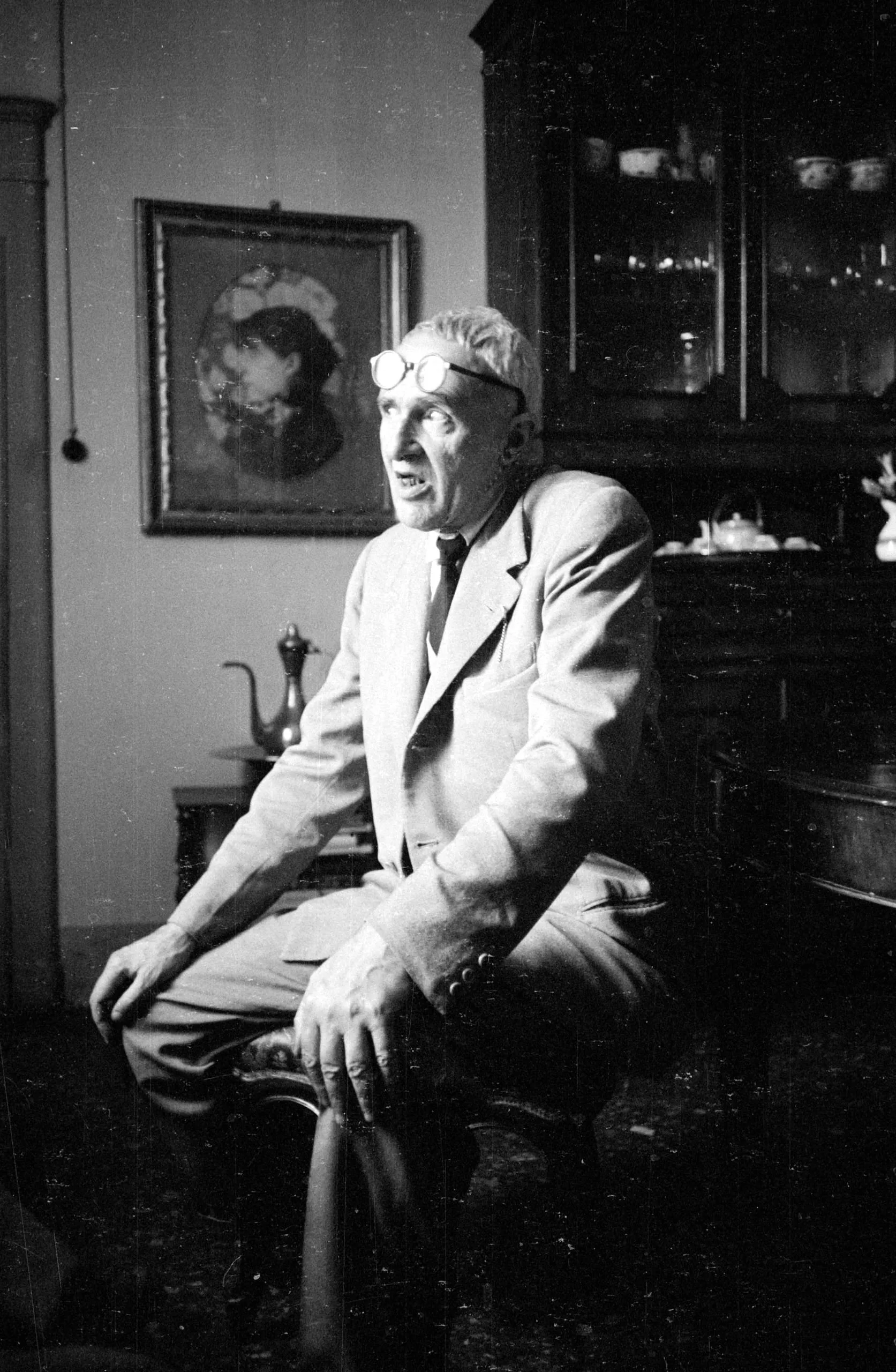Black and white photograph of a seated white man in a light suit, glasses pushed up on his forehead, mouth open, with a framed painting and dark wood cabinet visible behind him