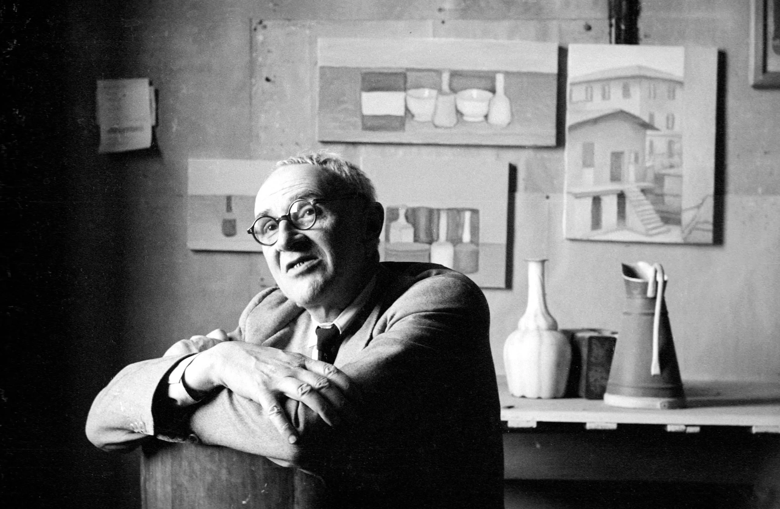 Black and white photograph of a white man in glasses and a blazer leaning on a chair back, mouth open, with paintings and ceramic vessels visible behind him