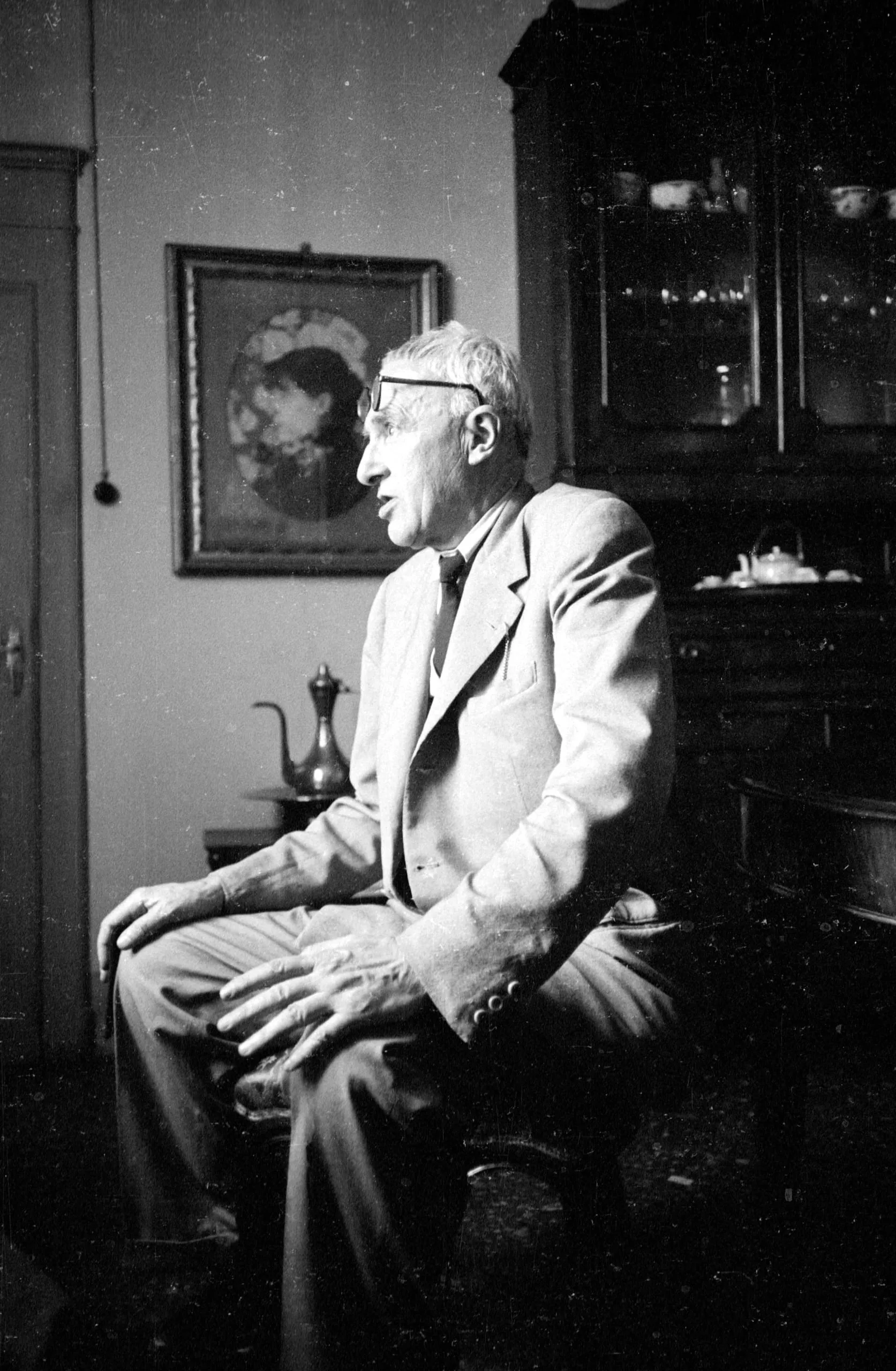 Black and white photograph of an older white man seated in profile, wearing a light blazer, with strong directional lighting and a framed painting visible on the wall behind him