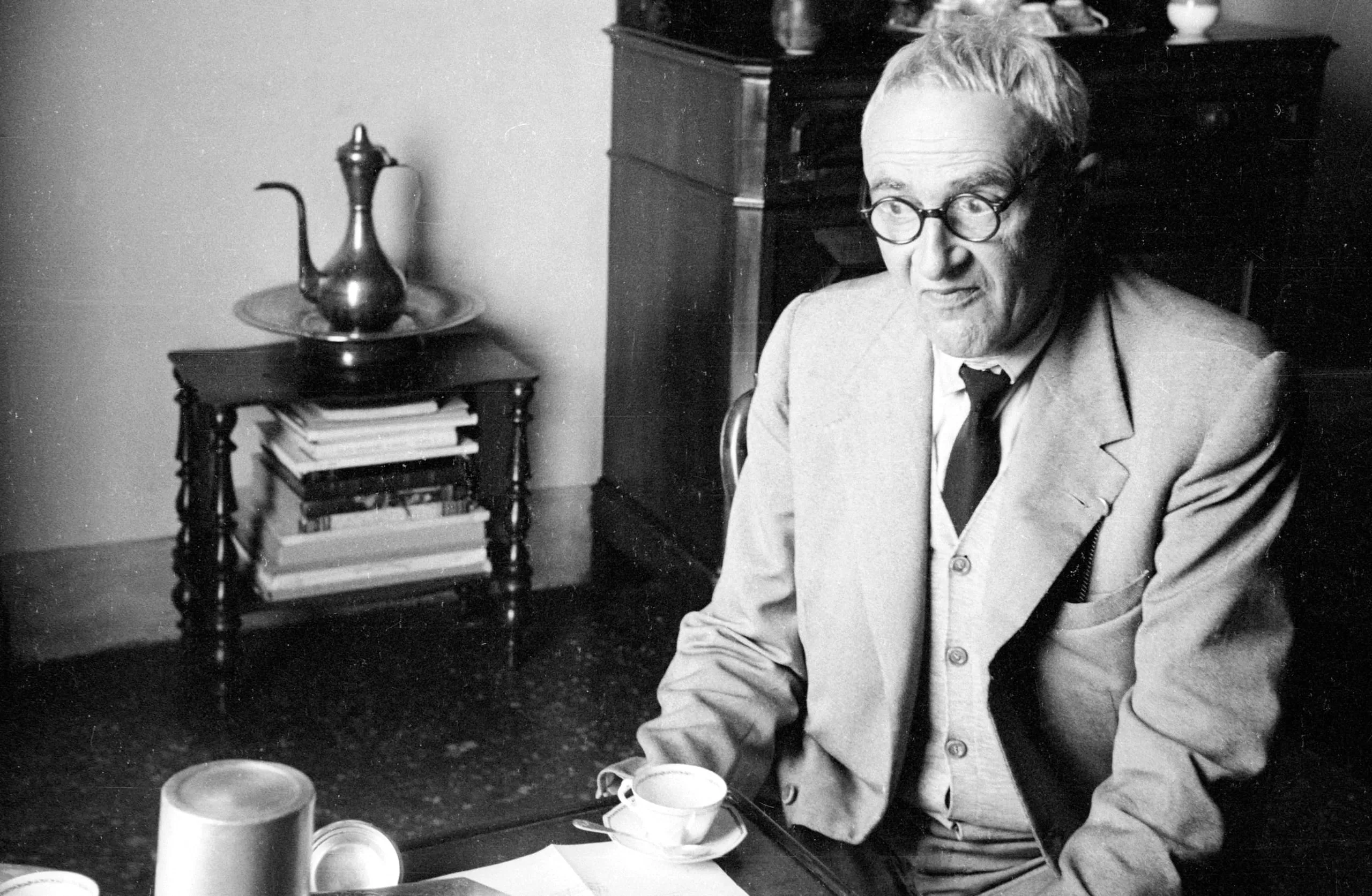 Black and white photograph of an older man in a three-piece suit and round glasses, seated at a dark table, leaning forward slightly, looking toward the camera