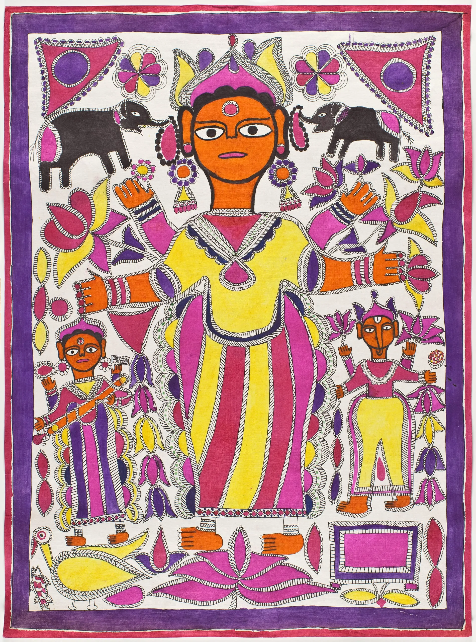 Madhubani or Mithila painting originated in northern Bihar, particularly in the village of Mithila in the Madhubani District, from which the art derived its modern names. Originally, these paintings, marked by their black outlines and striking color combinations, were executed on freshly plastered mud walls and floors of huts. They were collaborative efforts on the part of village women. The traditional imagery of these paintings concerns nature and fertility and is closely tied to events of ritual importance. Walls in family shrines were often painted, and the exterior walls of homes were decorated for weddings and festivals. For marriage celebrations, the nuptial chamber (kohbar ghar) was adorned with images having symbolic as well as auspicious properties.