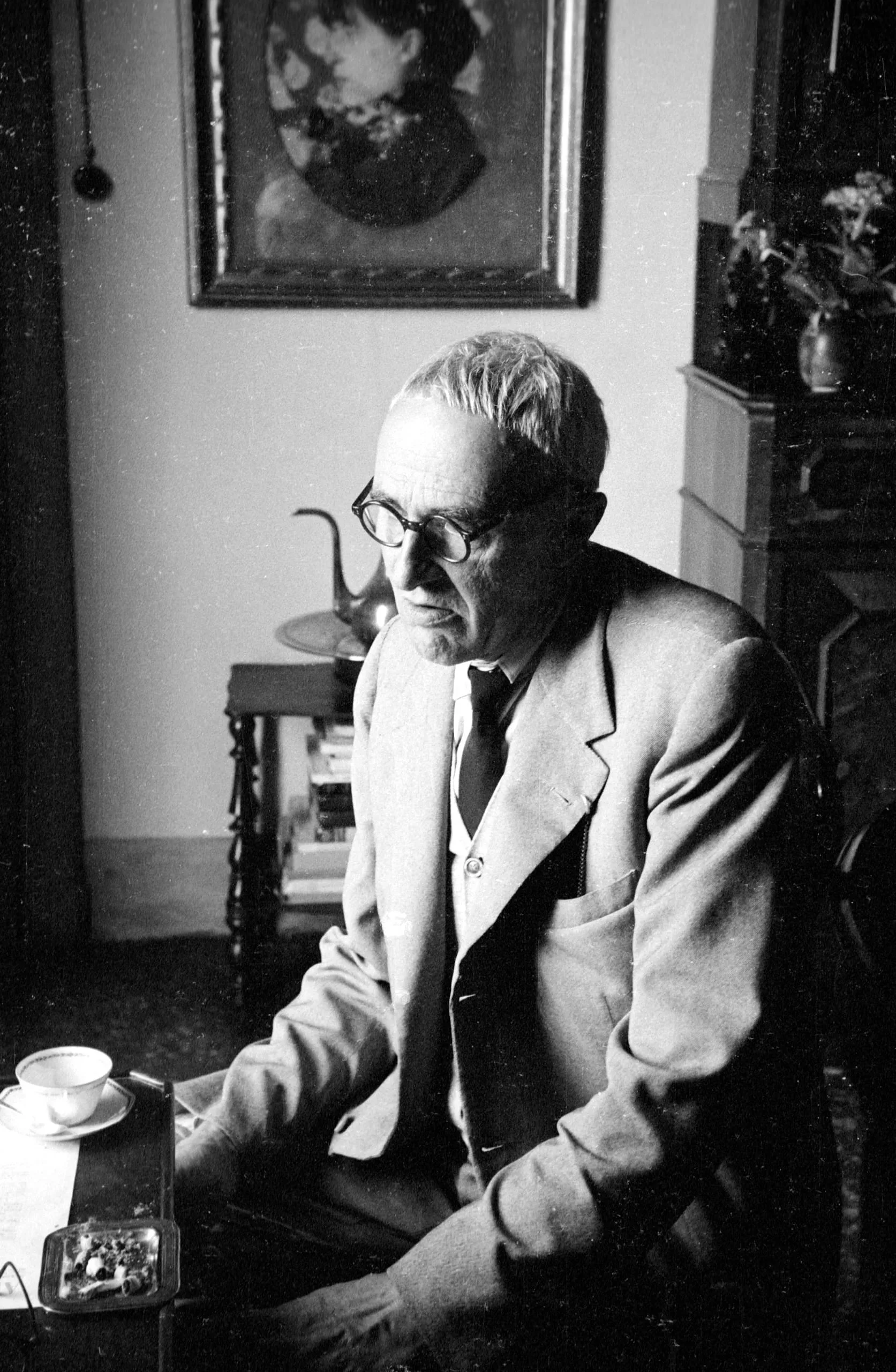 Black and white photograph, a gray-haired white man in a suit and round glasses seated and looking downward, lit strongly from the left