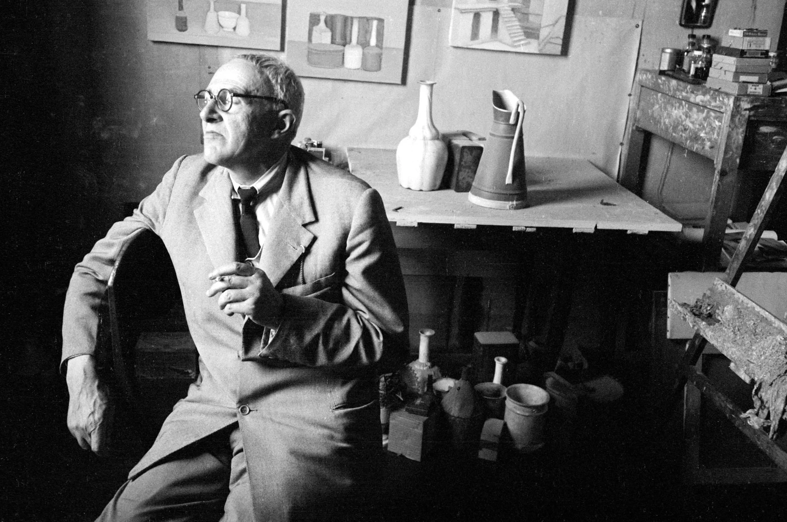 Black and white photograph of a man in a suit seated in an artist's studio, turned in three-quarter profile, holding a cigarette, with ceramic vessels and paintings visible behind him