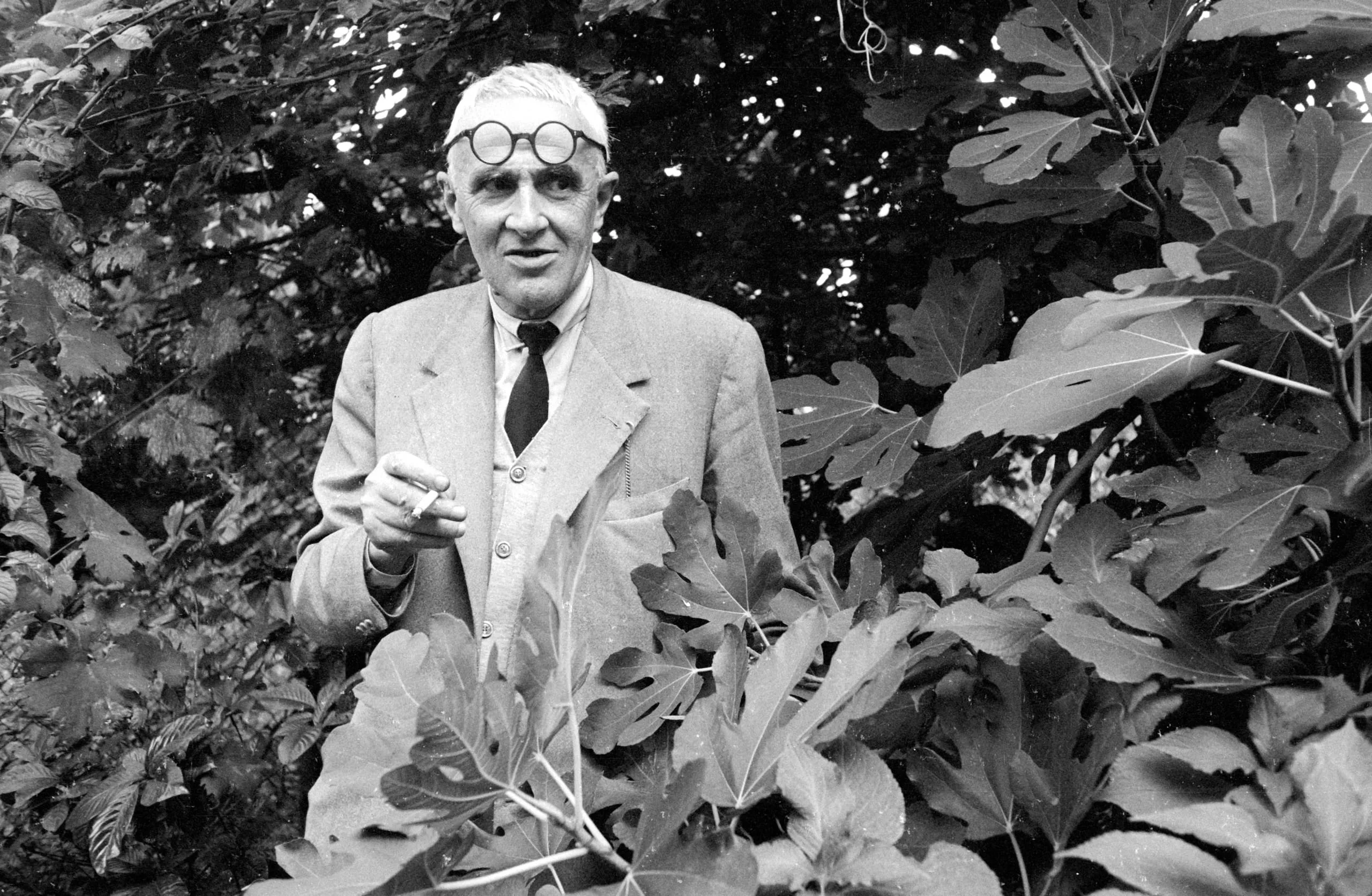 Black and white photograph of a white man in a suit and round glasses standing among large-leafed garden foliage, holding a cigarette