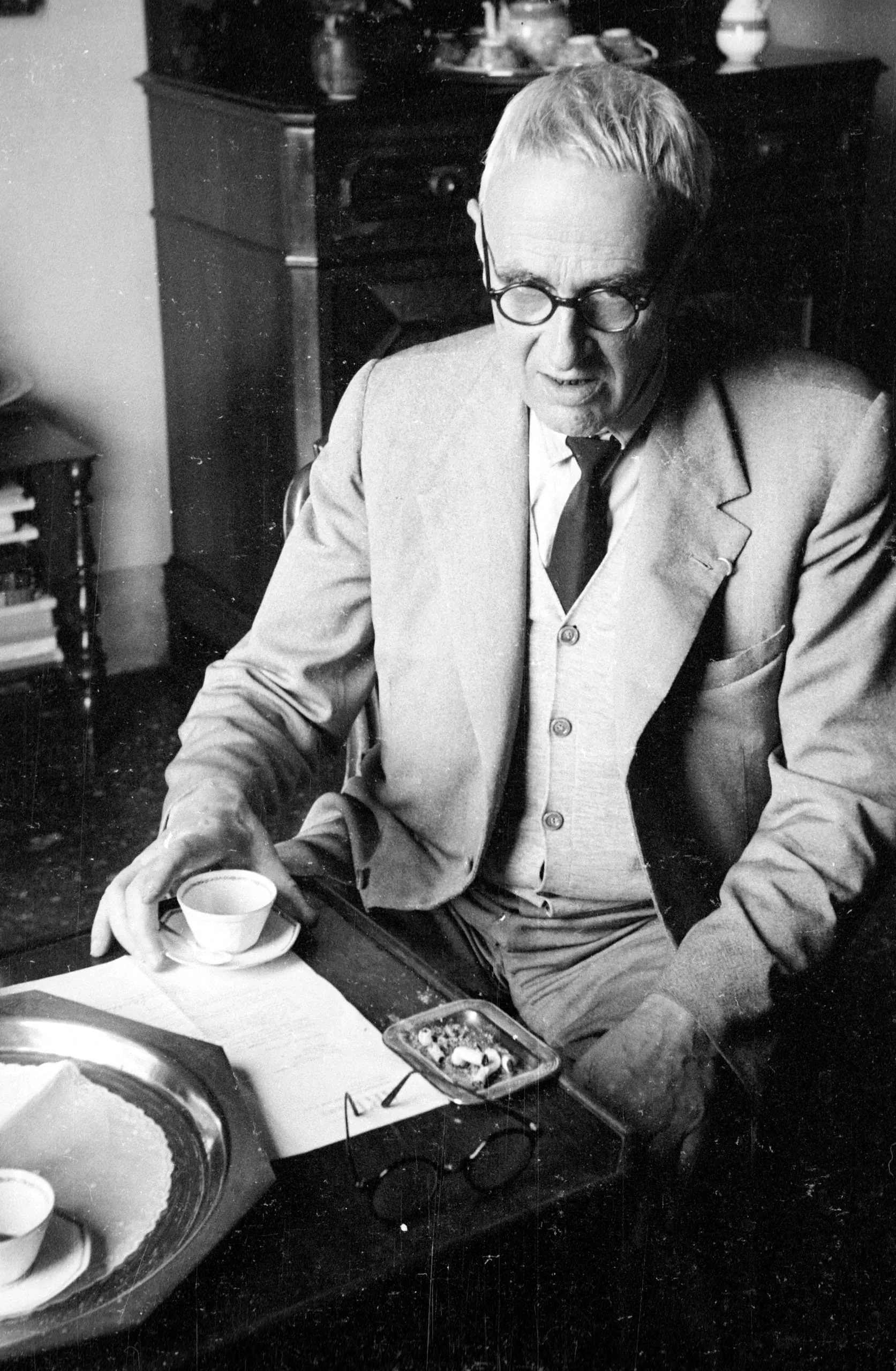 Black and white photograph of an older white man in a three-piece suit and round glasses, leaning over a dark table with cups, papers, and a folded pair of glasses