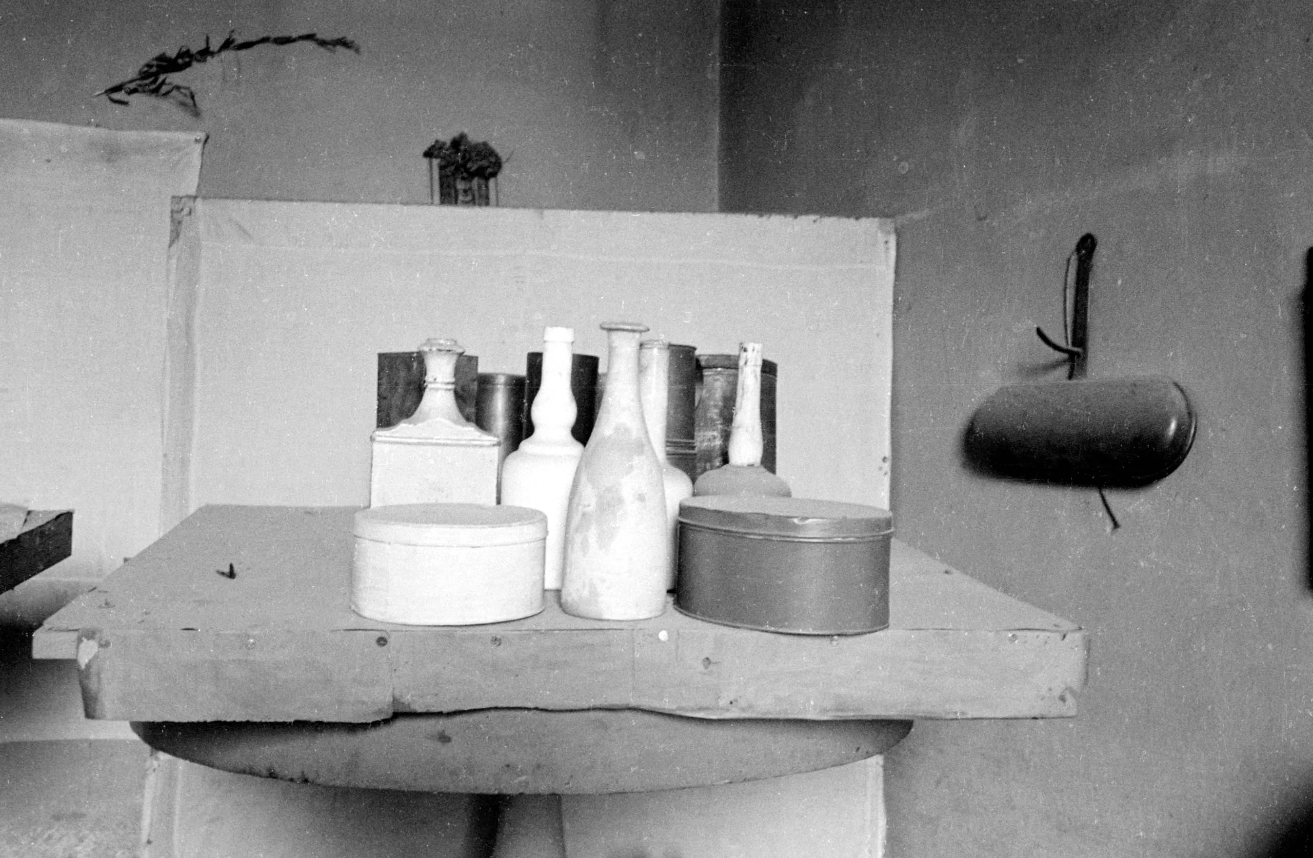 Black and white photograph of a rough wooden corner shelf holding ceramic bottles, metal canisters, and round lidded boxes against plain walls