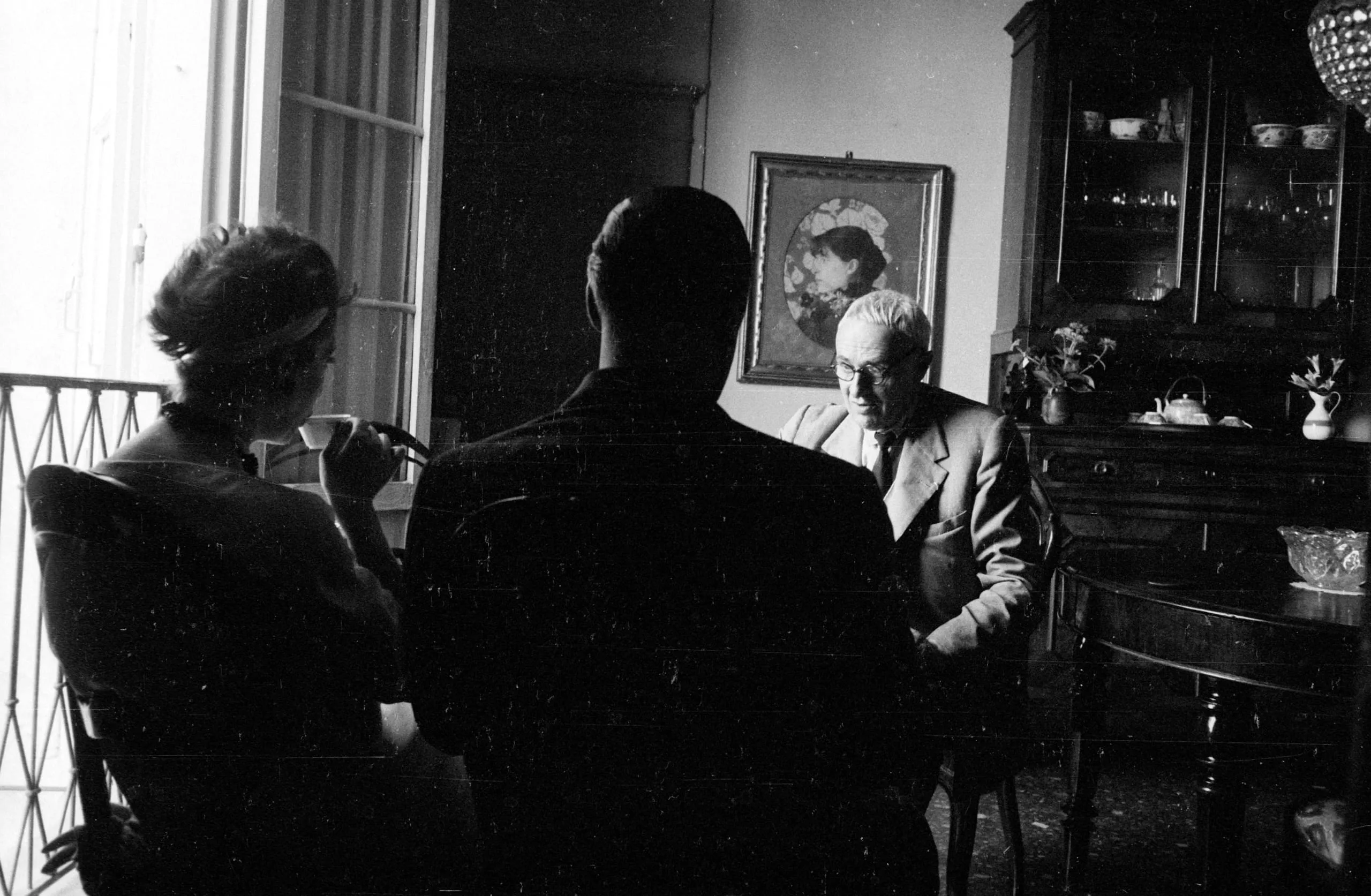 Black and white photograph of three people seated around a table in a domestic interior, two figures in silhouette against a bright window, one older man in a suit and glasses facing the camera