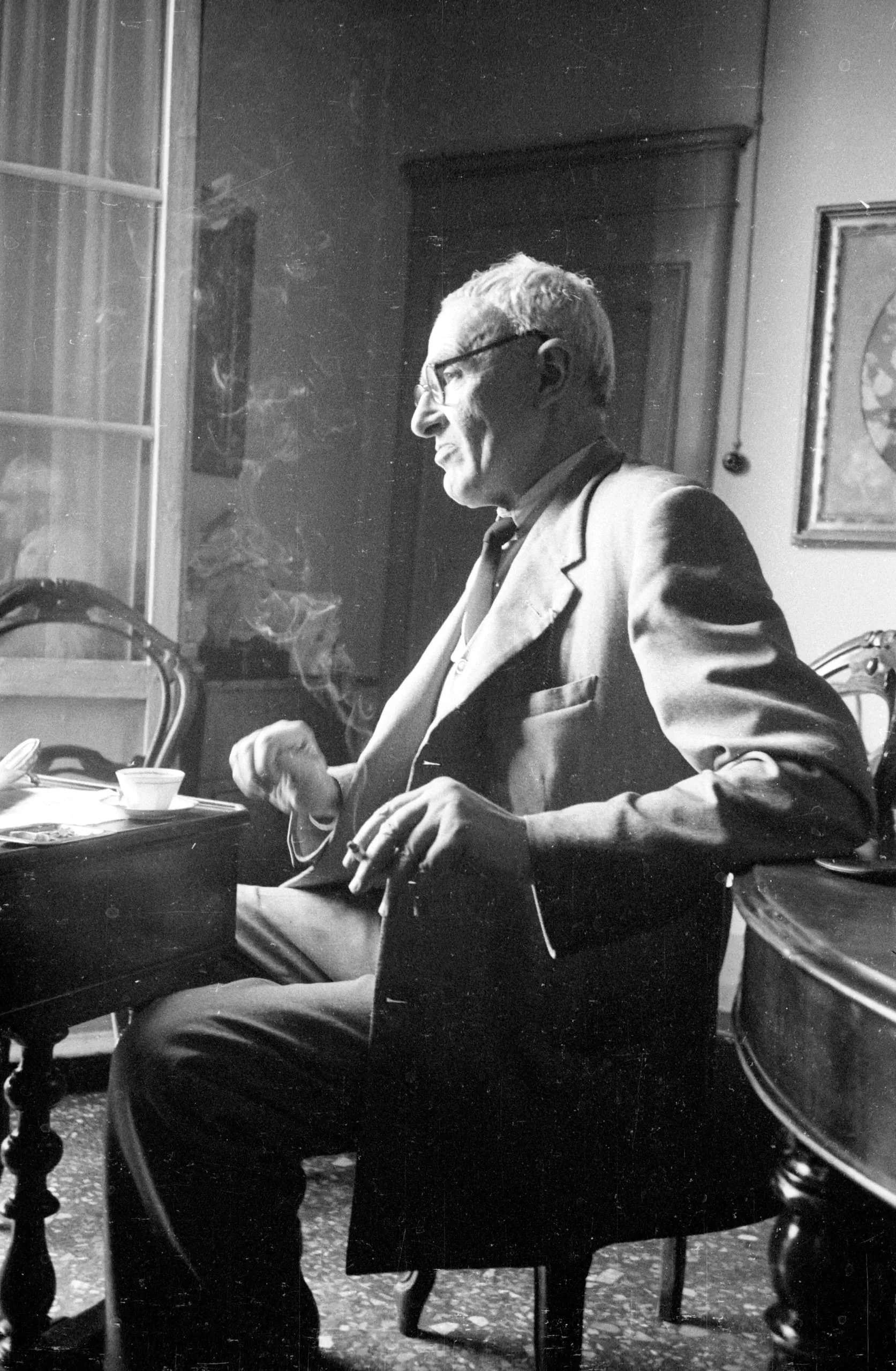 Black and white photograph of an older white man in a suit and bow tie, seated in profile facing left, holding a cigarette, lit by a window