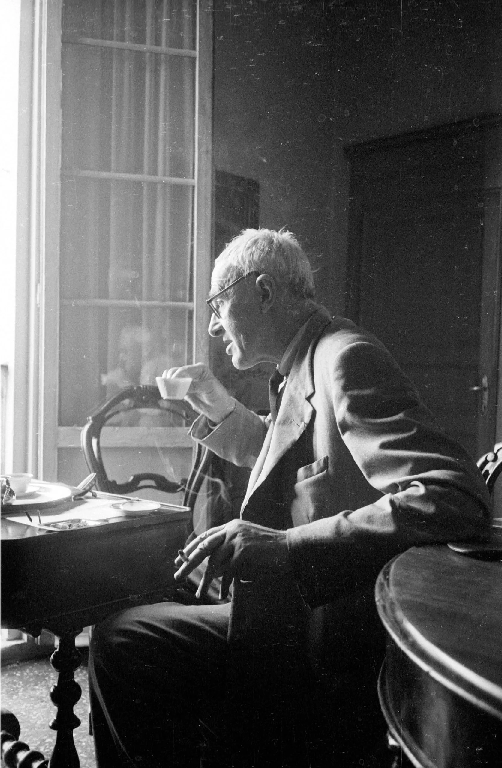 Black and white photograph of an older white man in a dark blazer seated in profile at a cluttered desk, holding a cup near his chin, with bright window light behind him
