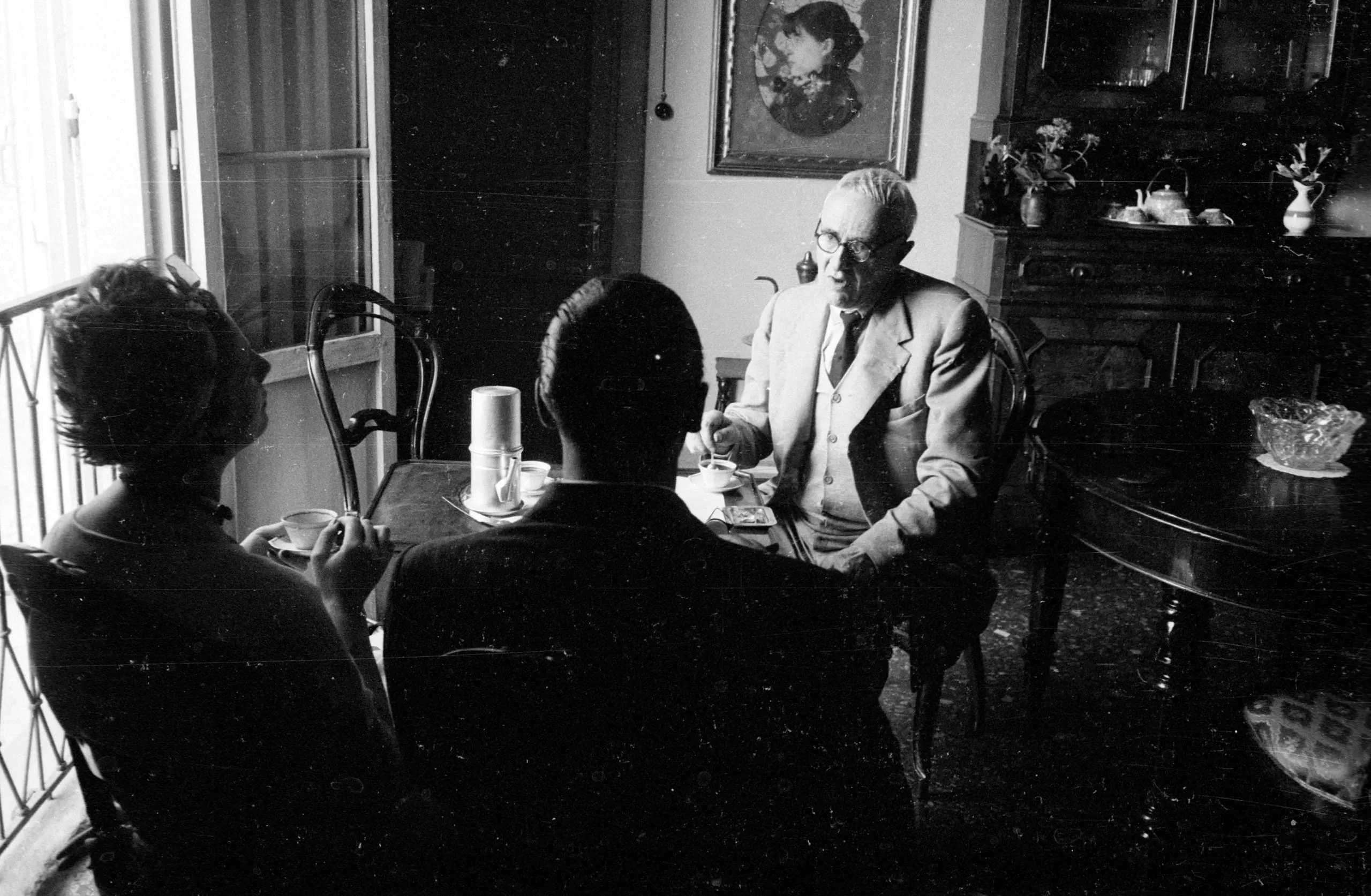 Black and white photograph of three people seated around a small table in a home interior, two figures in silhouette with backs to camera, one older man in suit and bow tie facing them