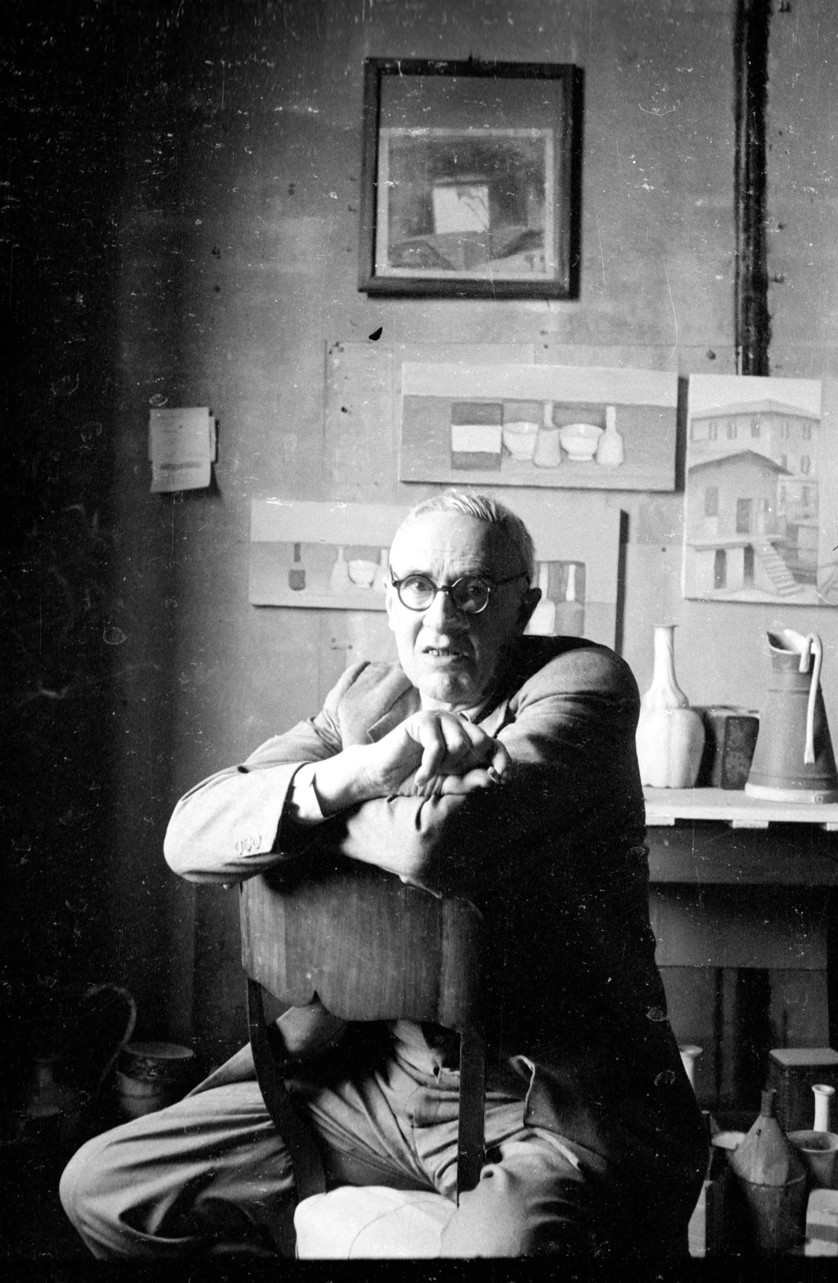 Black and white photograph of an older white man in a suit seated backwards on a wooden chair, arms folded over the chair back, in a studio with paintings and ceramic vessels