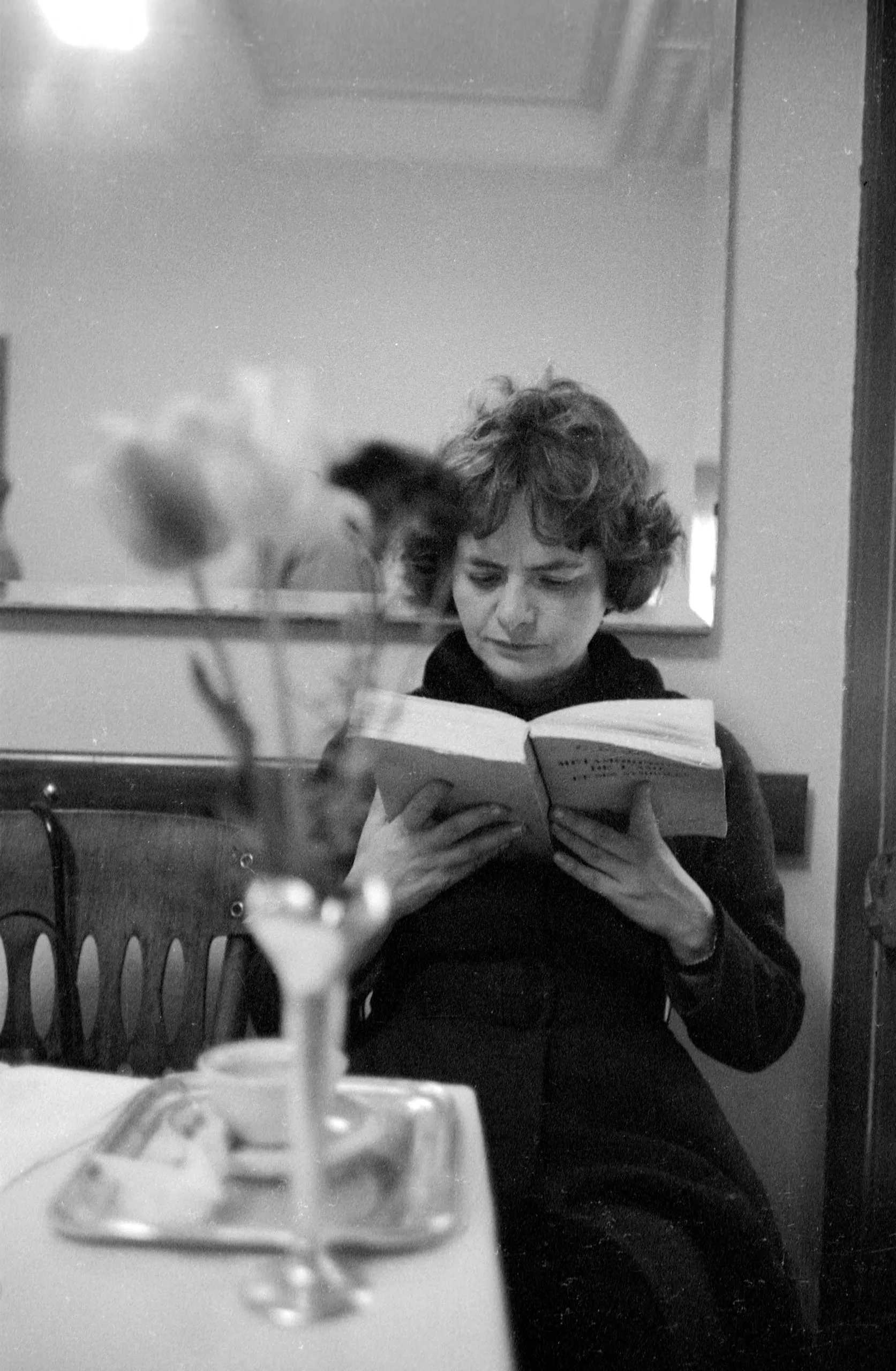 Black and white photograph of a woman with short curly hair reading a paperback book at a café table, soft diffused lighting, flowers and a silver tray out of focus in the foreground