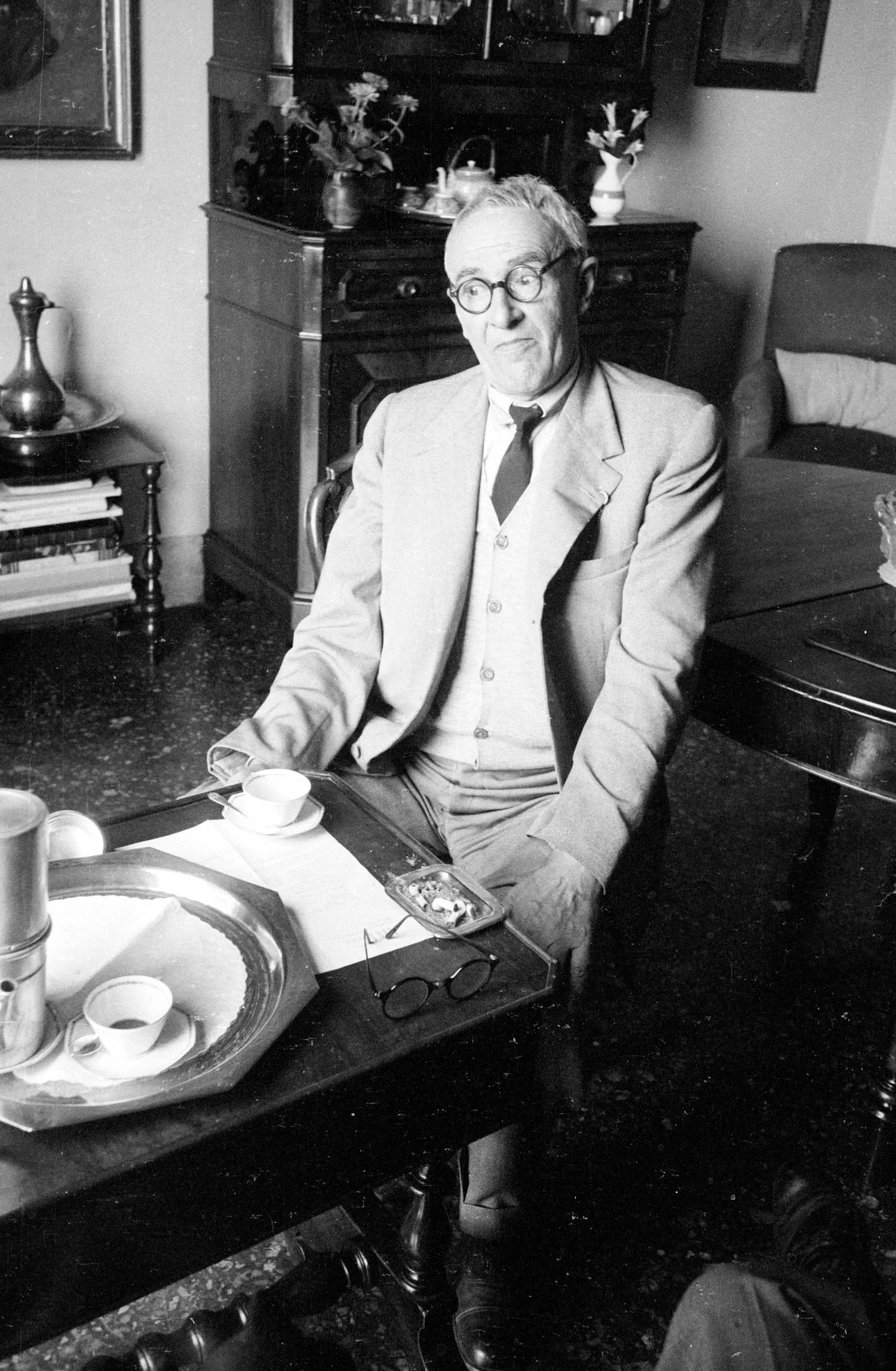Black and white photograph of an older white man in a light suit seated at a table with a coffee service tray, round glasses resting on the tabletop