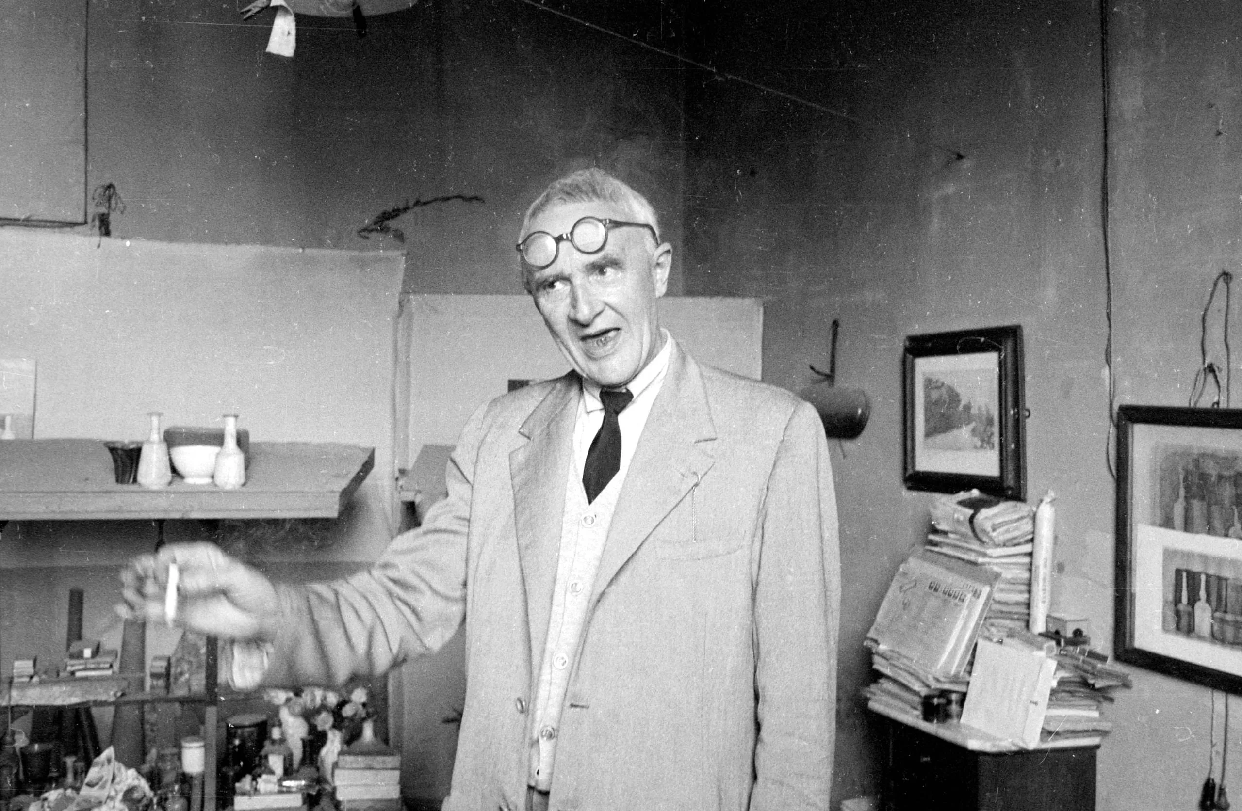 Black and white photograph of an older man in a suit and round glasses, mouth open mid-speech, arm extended in gesture, standing in a cluttered studio
