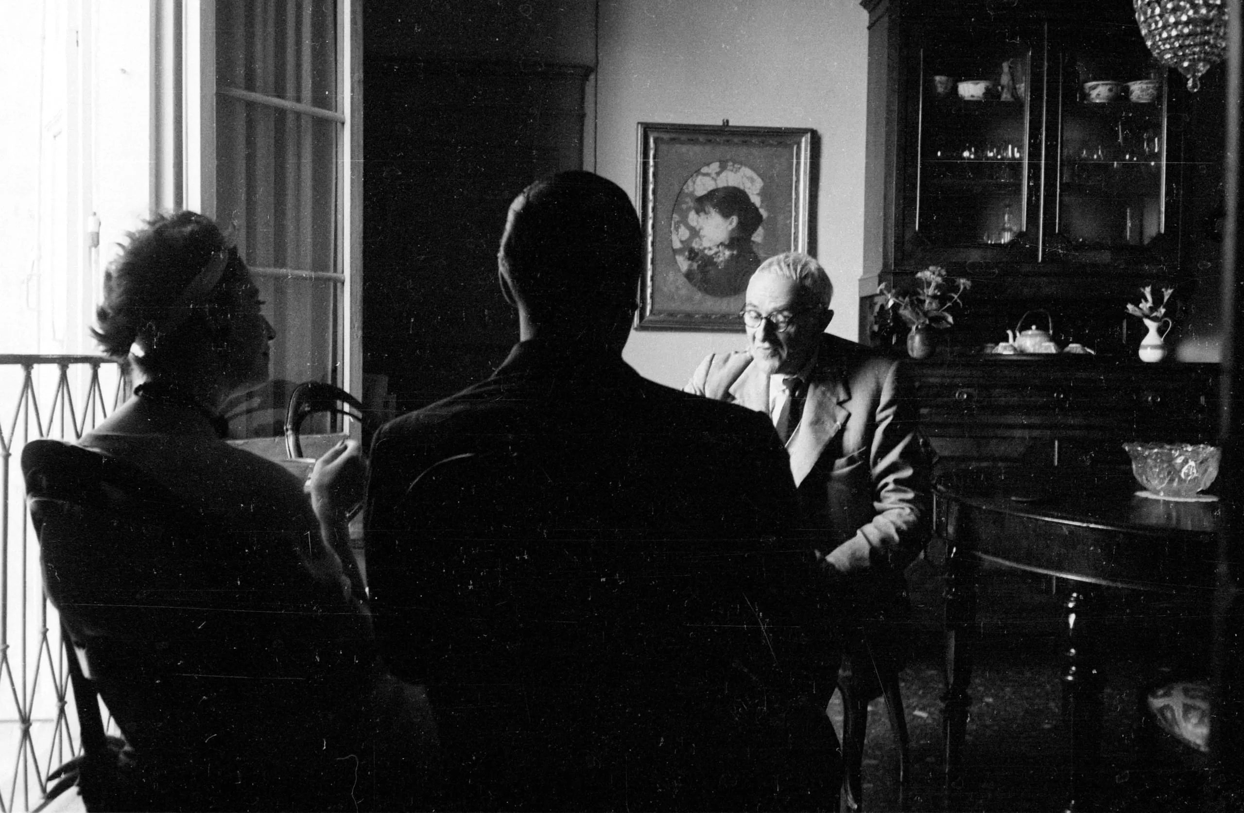 Black and white photograph of three figures seated at a table indoors, two in near-total silhouette against bright window light, one older man in glasses visible at right