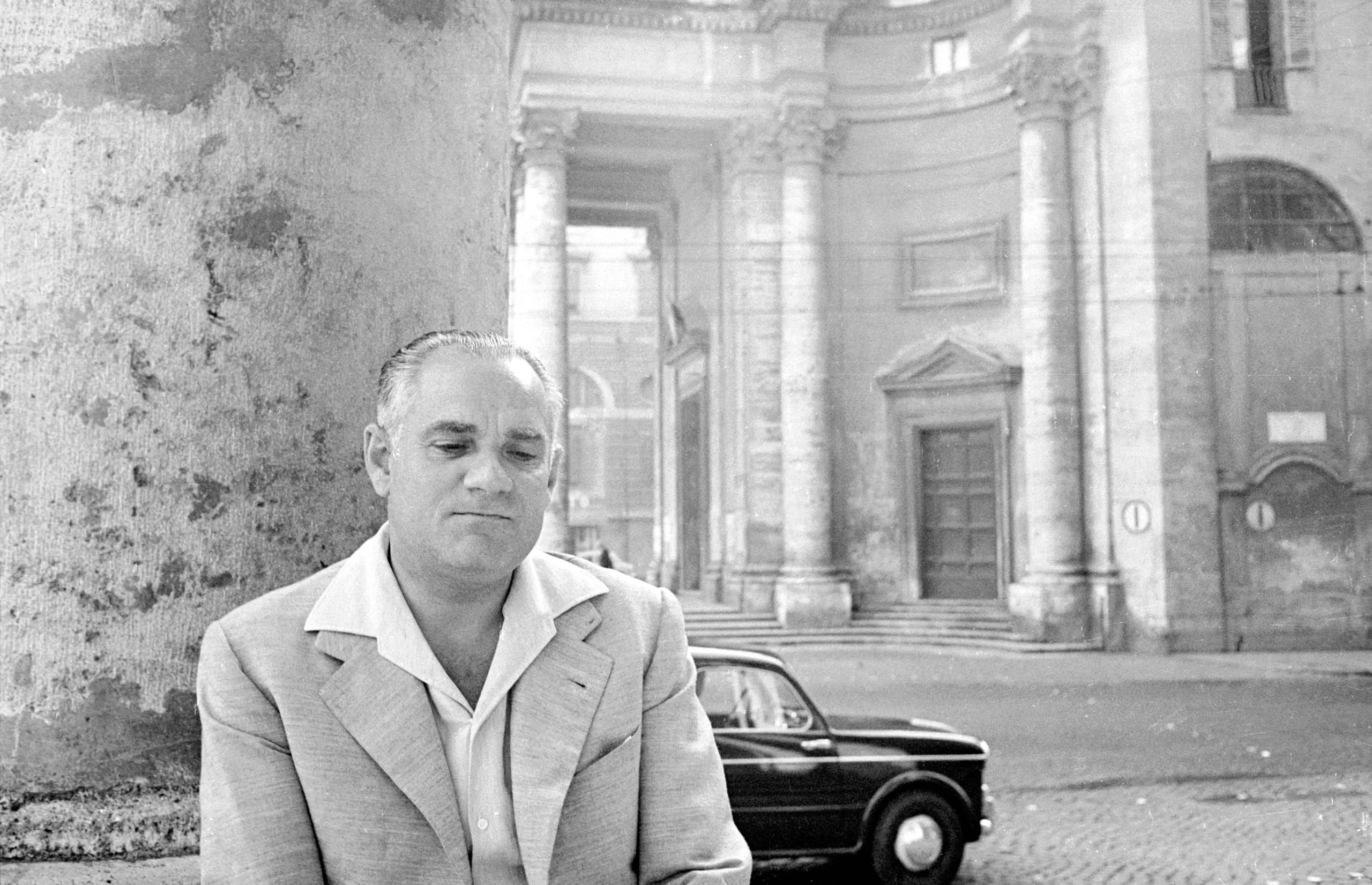 Black and white photograph, close-up portrait of a dark-haired man in a linen blazer leaning against a stone column, classical columned building in the background