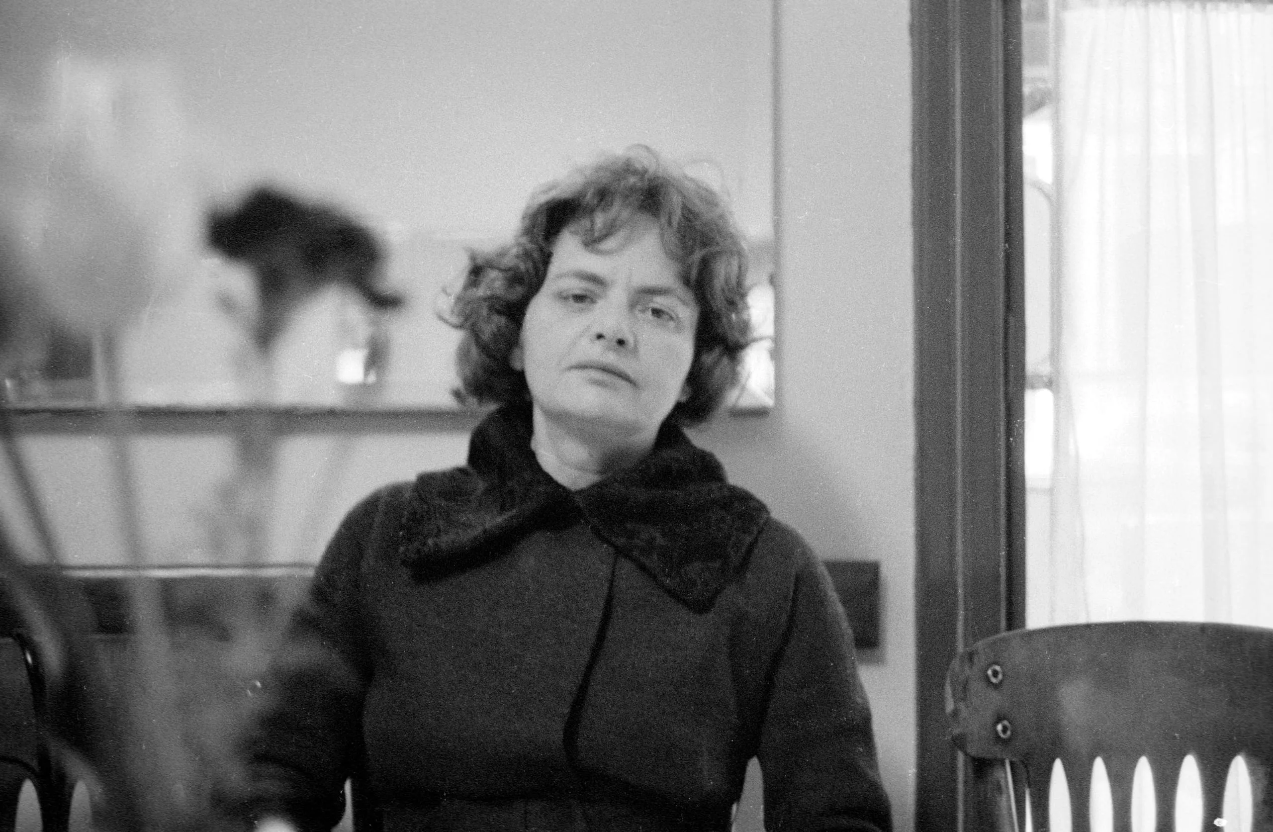 Black and white photograph, white woman with short curly brown hair seated facing camera, wearing a dark coat with fur-trimmed collar, indoor setting