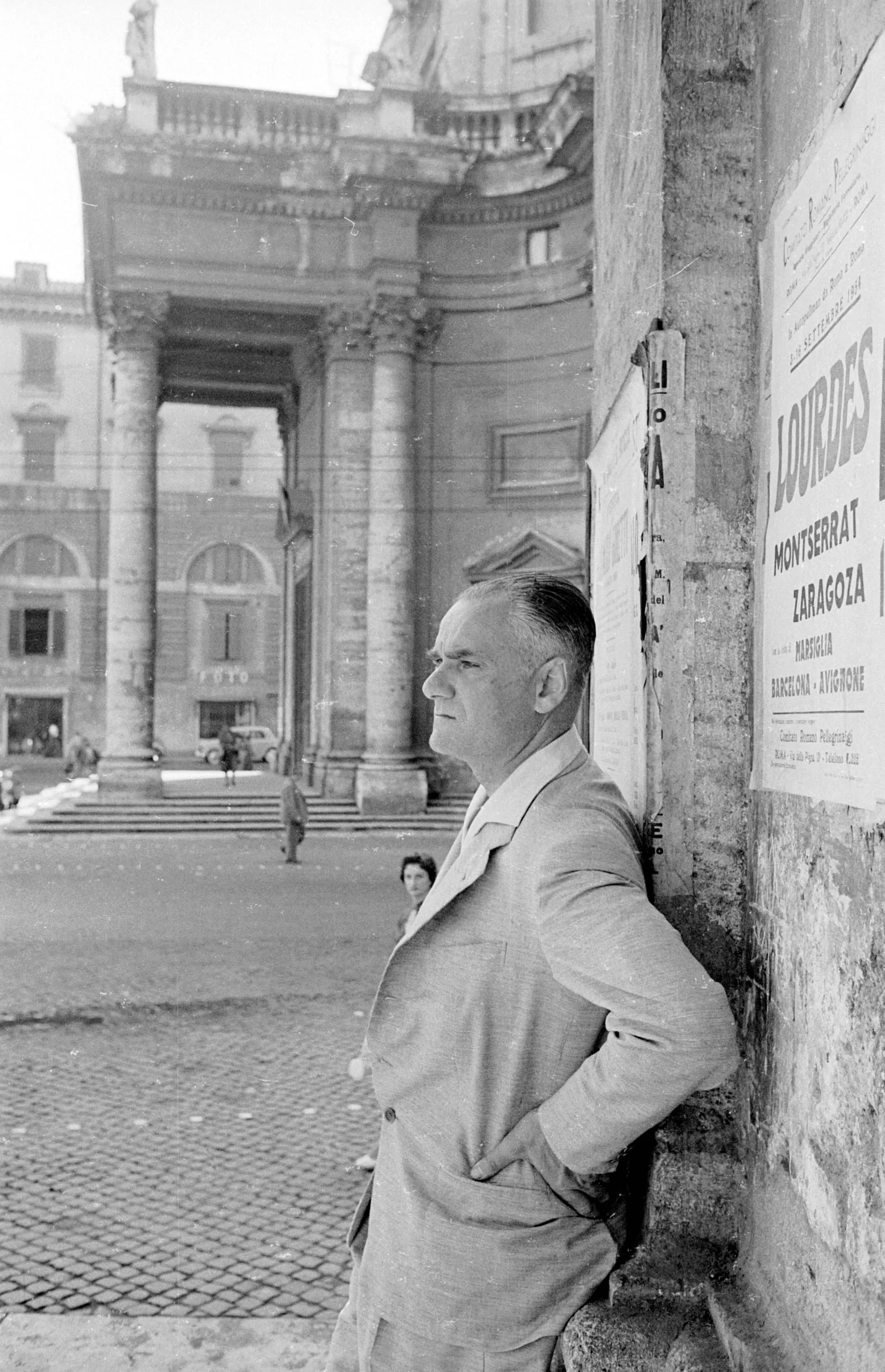 Black and white photograph of a heavyset man in a light suit leaning against a stone wall in profile, with a columned building and cobblestone plaza behind him