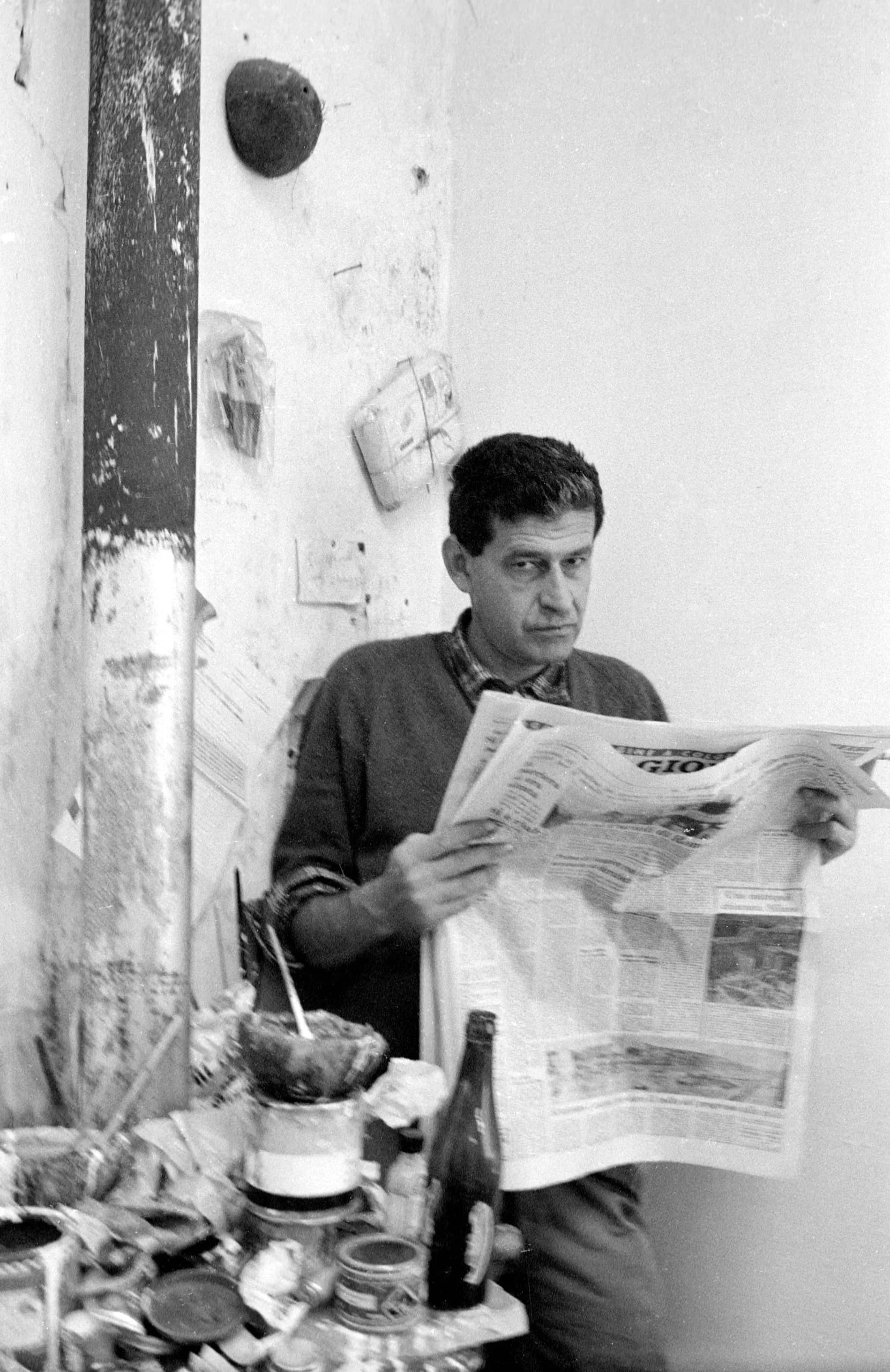 Black and white photograph of a man sitting in a cluttered studio, reading an open newspaper, with paint-stained jars and brushes on a table in front of him