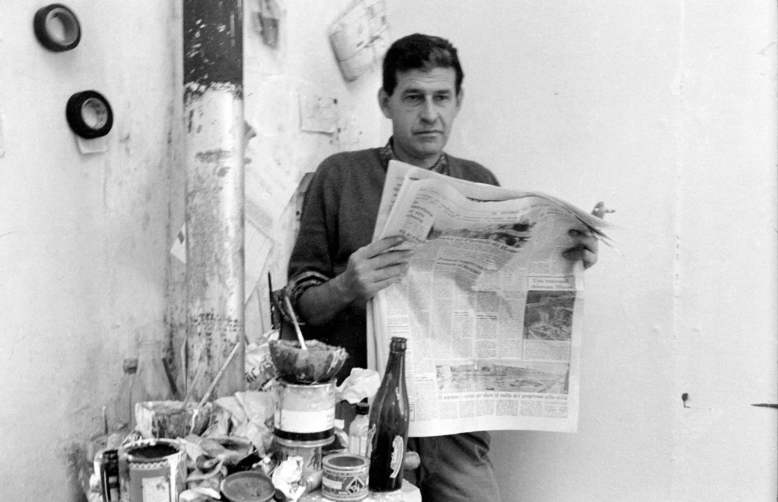 Black and white photograph of a white man holding an open broadsheet newspaper, standing before a cluttered paint-covered work table in what appears to be an artist's studio