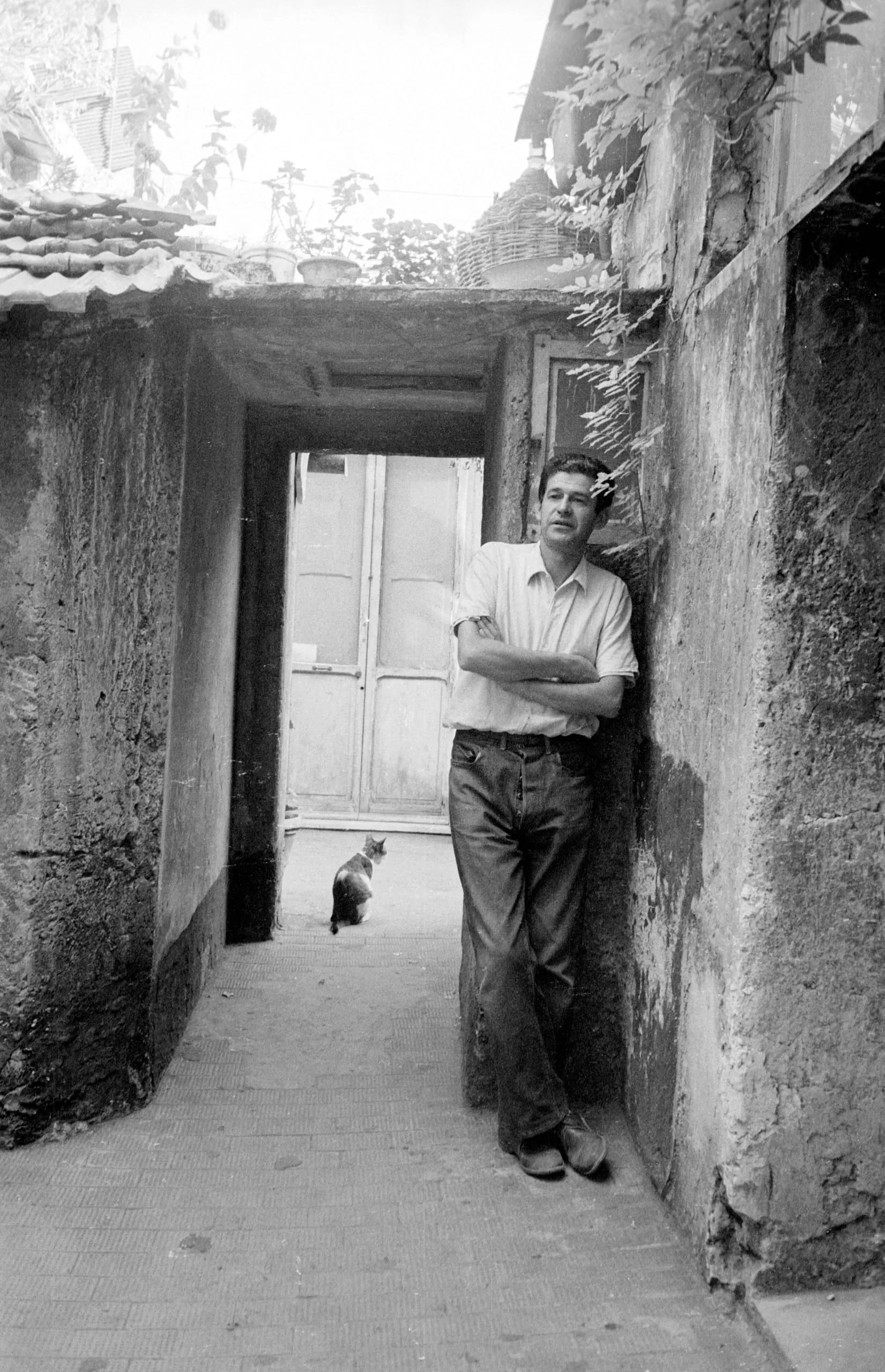 Black and white photograph of a man with crossed arms leaning against a stone wall in a narrow outdoor passageway, a cat visible in the background