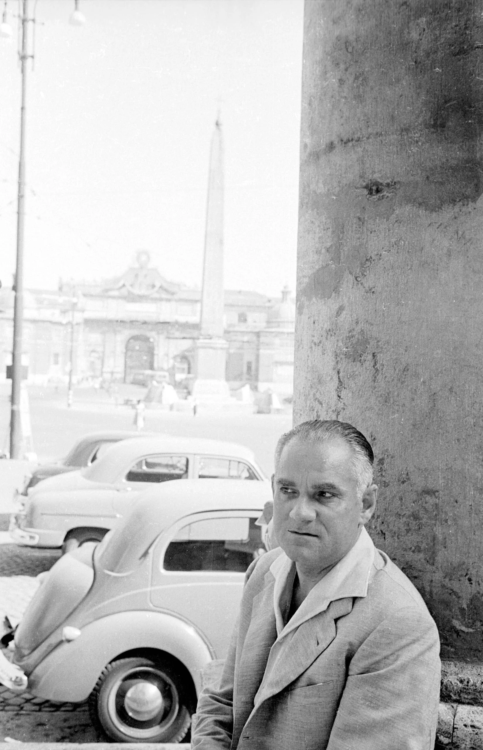 Black and white portrait photograph, white man in light blazer, chest up, looking at camera, with parked mid-century cars and an obelisk visible in the background