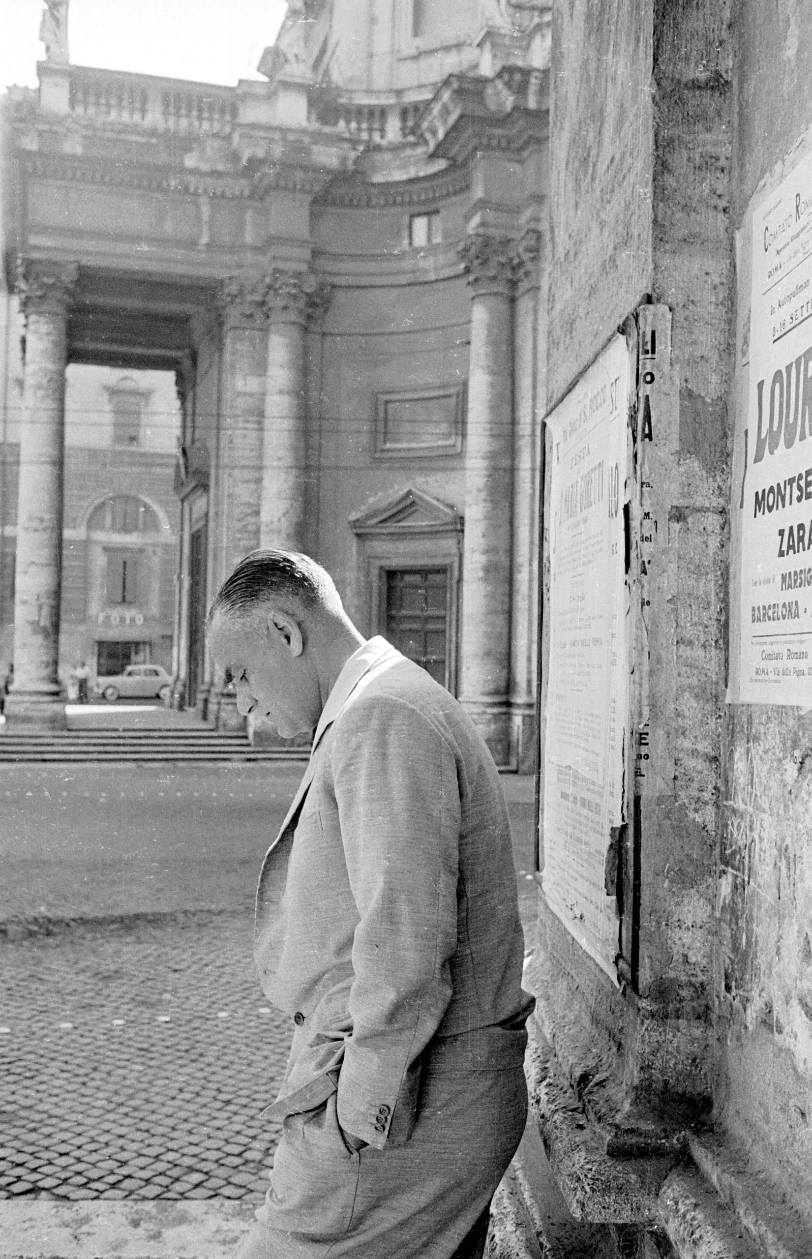 Black and white photograph of a white man in a light suit, head bowed, leaning against a weathered wall posted with bills, a classical colonnade out of focus behind him