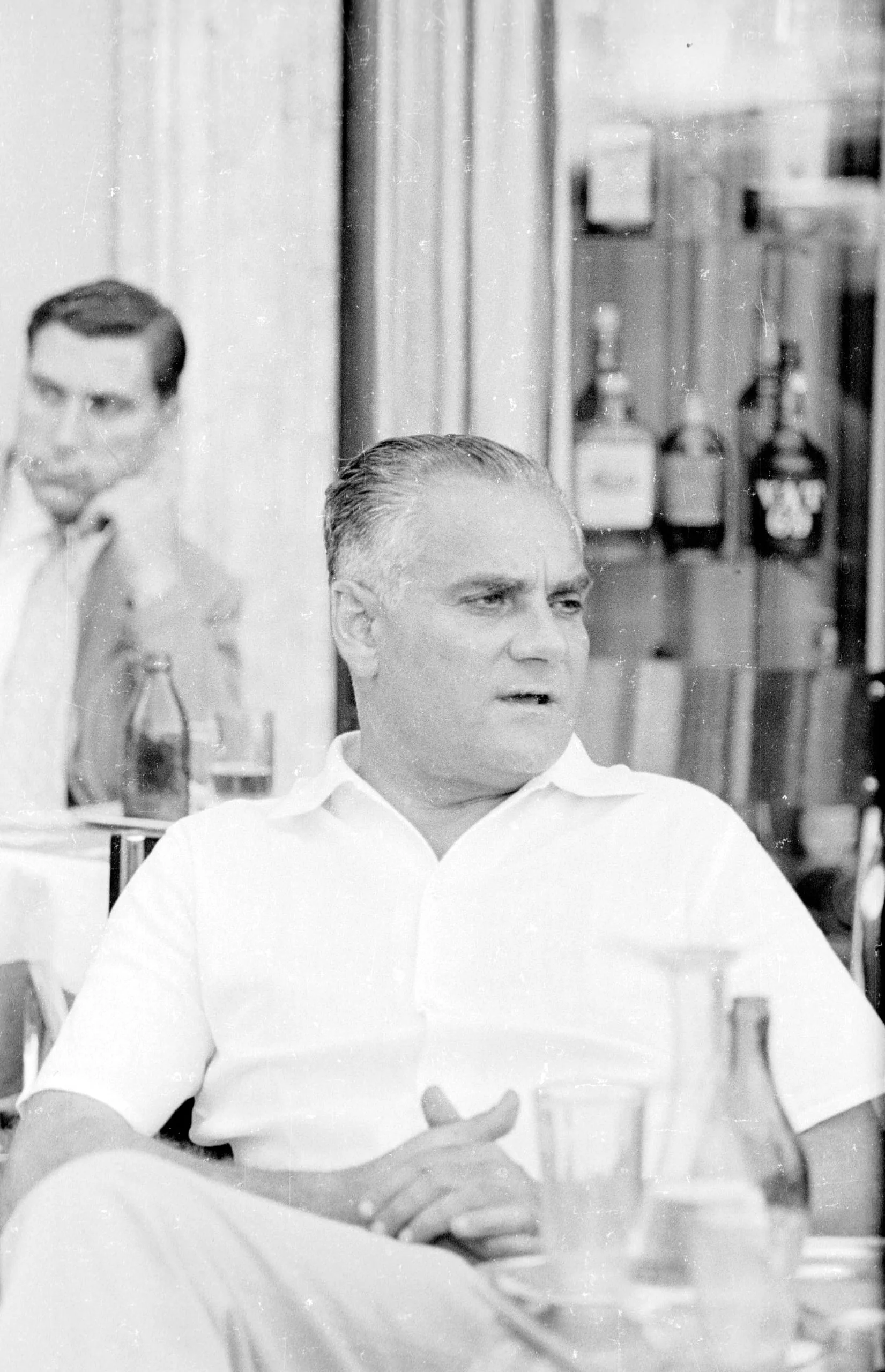 Black and white photograph of a heavyset man in a white short-sleeved shirt seated and speaking, with a second man in a suit visible out of focus behind him