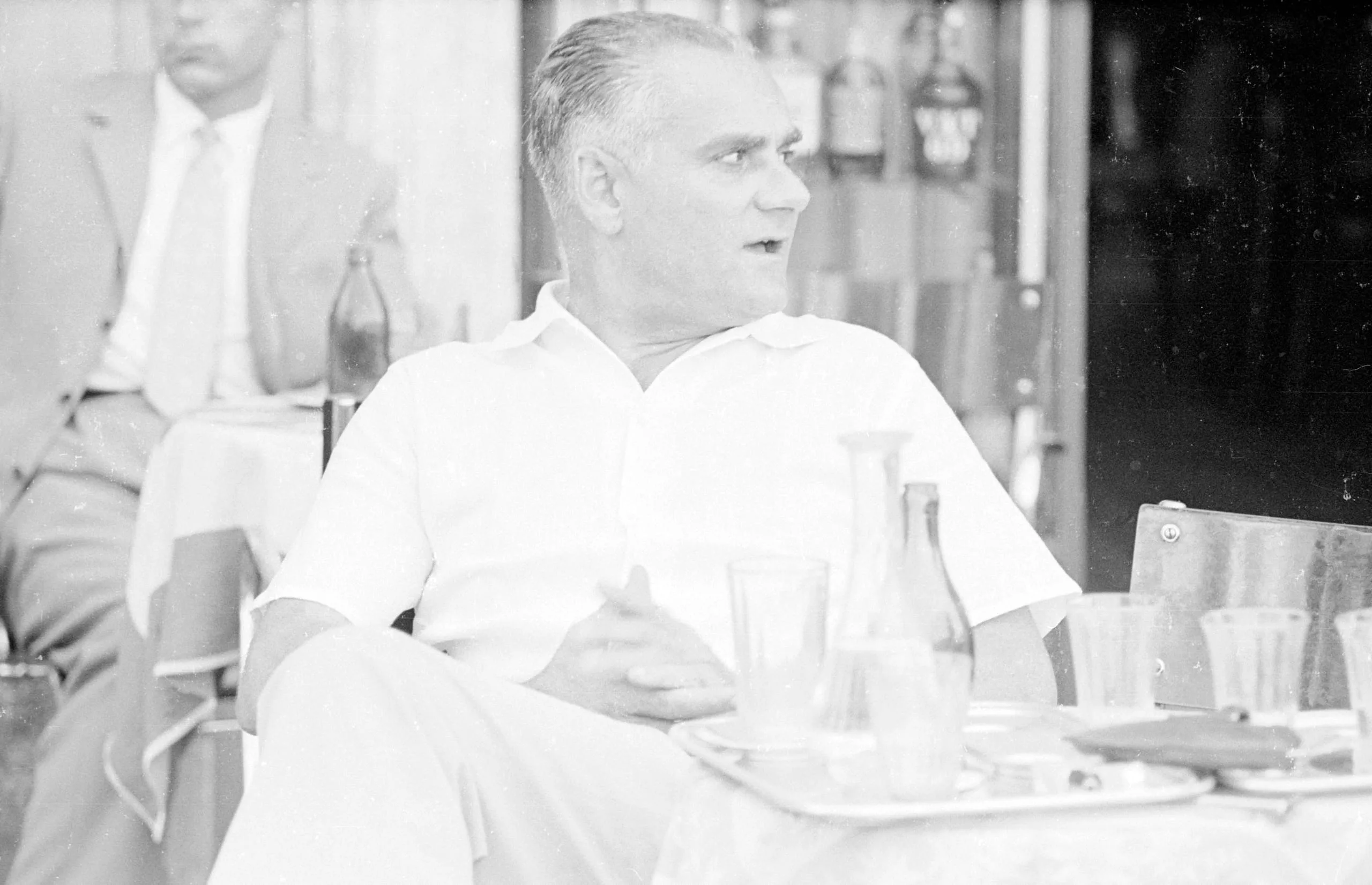 Black and white photograph of a heavyset man in a white short-sleeved polo shirt seated at a table, head turned to the right, lips parted, with bottles and glasses on a tray before him
