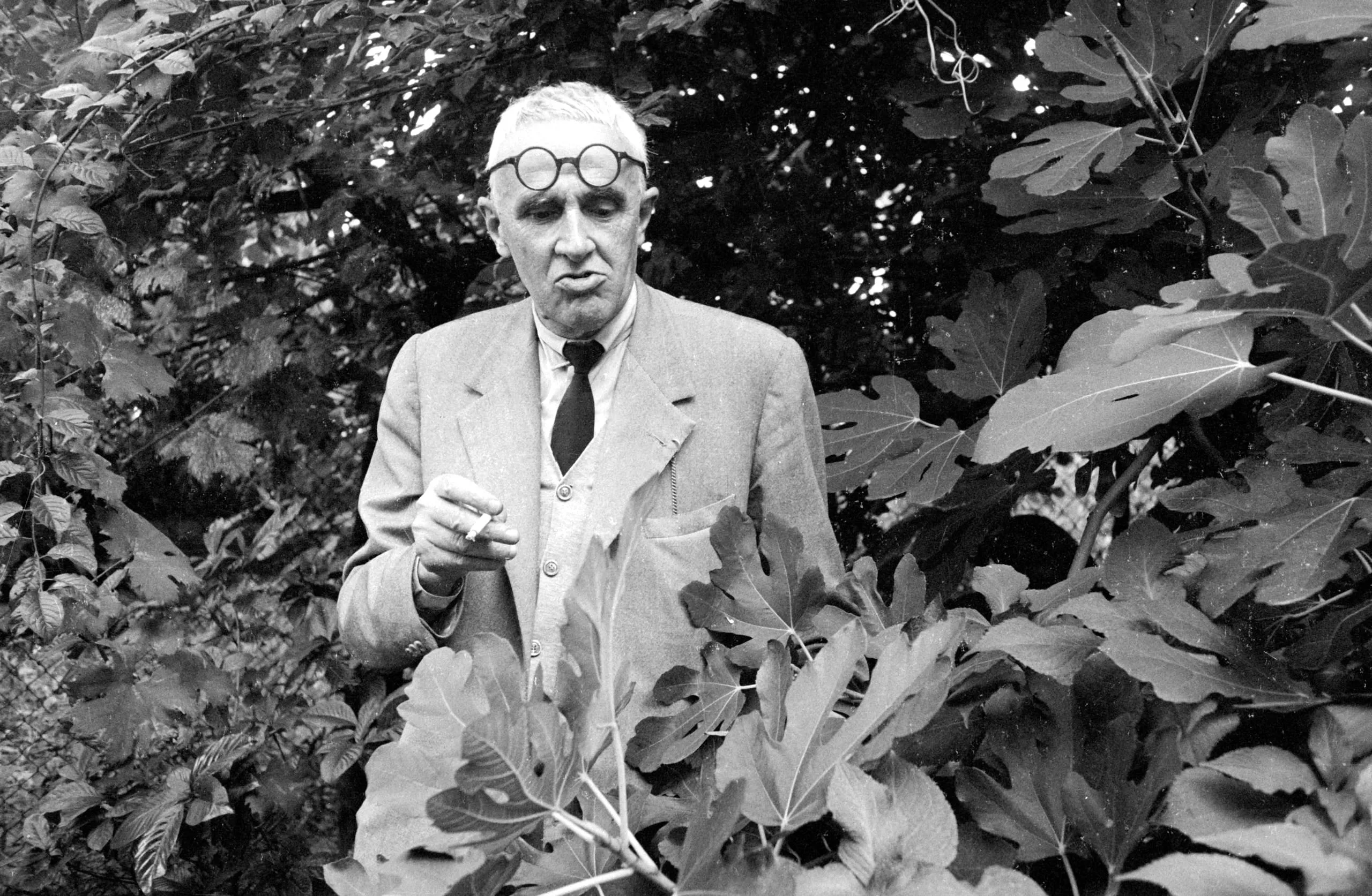 Black and white photograph of an older man in a rumpled suit, two pairs of round glasses, standing among large-leafed garden plants