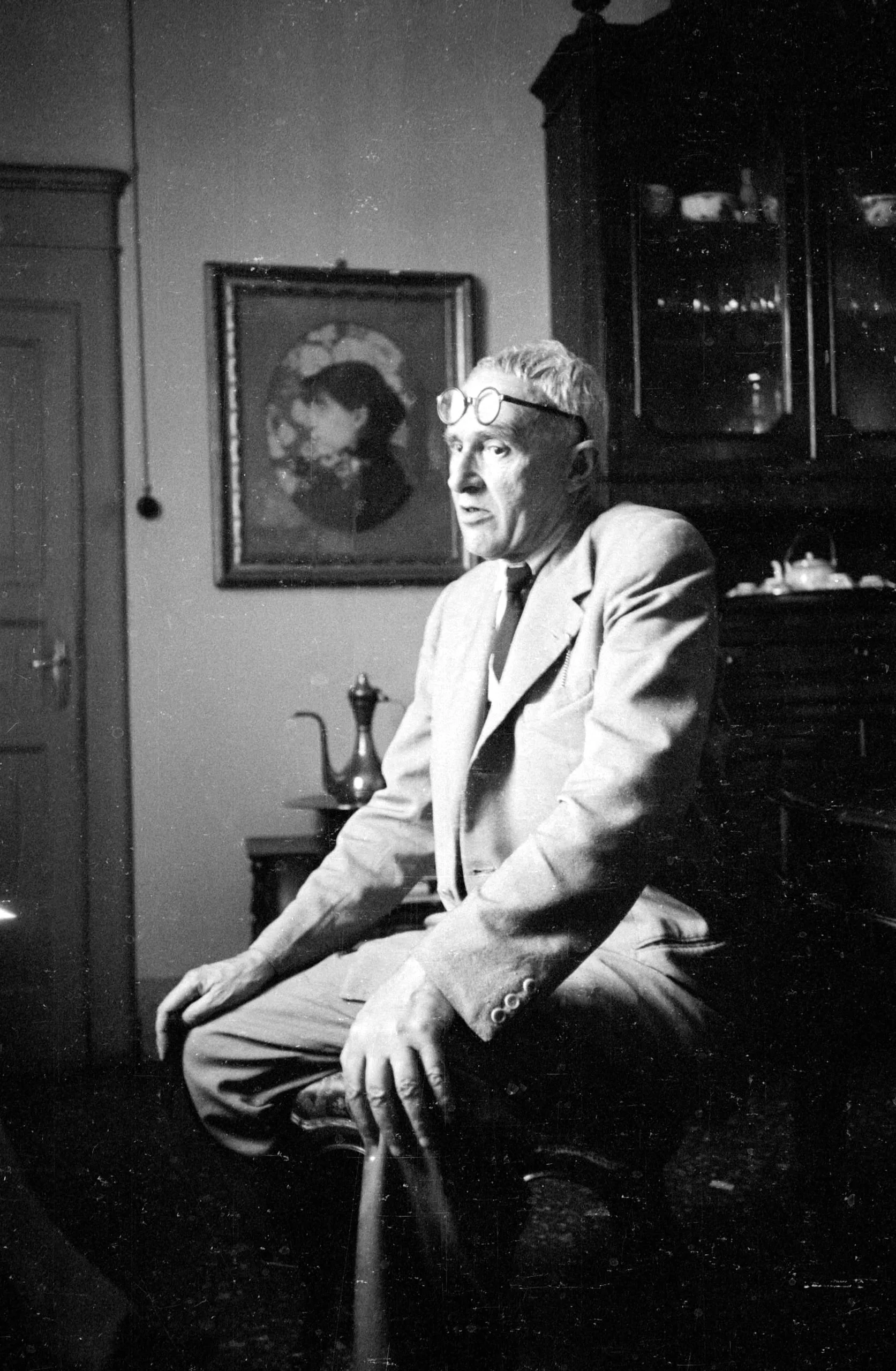 Black and white photograph of an older white man with round glasses and white hair, seated in a dimly lit room, turning slightly to his right