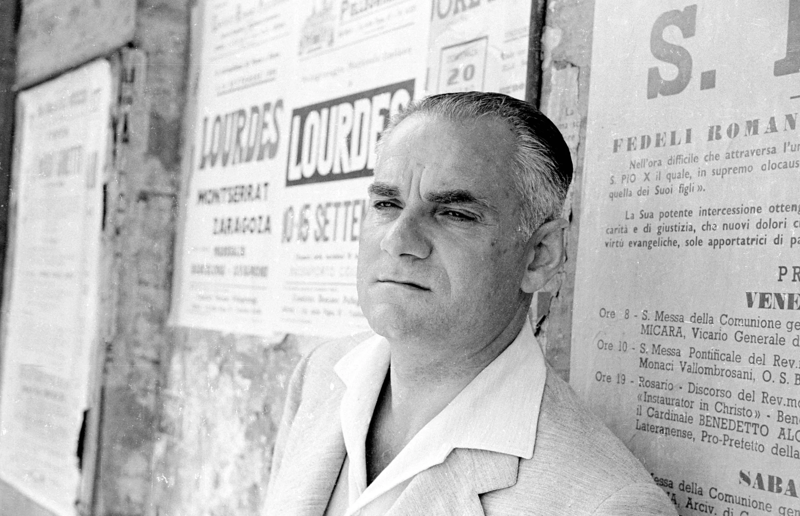 Black and white photograph, chest-up portrait of a middle-aged man with short gray hair leaning against a wall covered in Italian-language posters