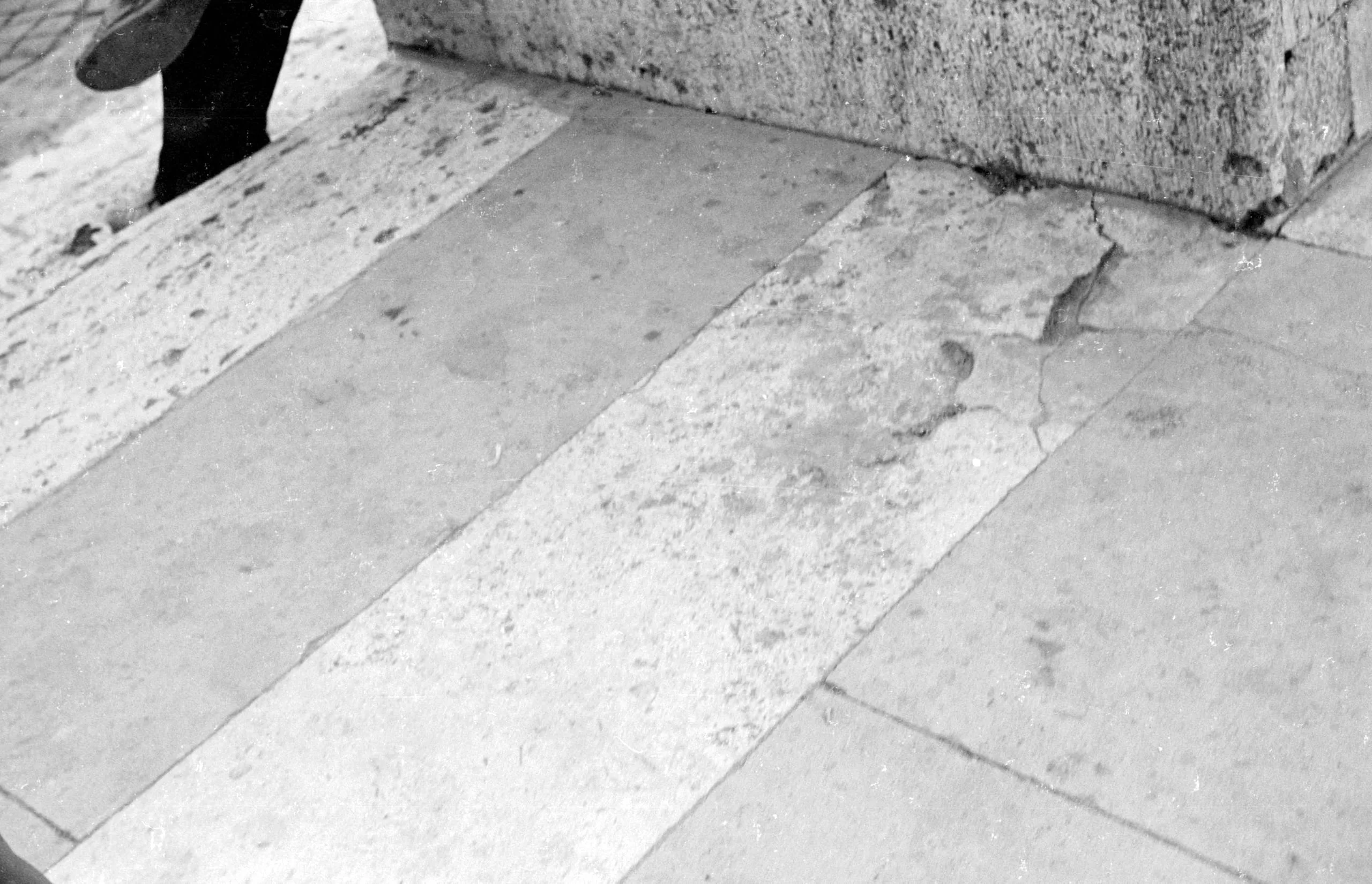 Black and white photograph looking down at worn stone pavement meeting a rough masonry wall, with one cracked and lifted paver near the corner and a partial shoe visible at upper left