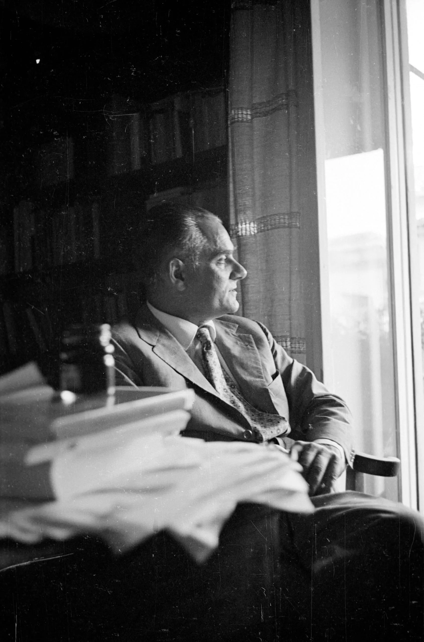 Black and white photograph, white man in a suit and patterned tie seated in profile, facing a bright window, with a stack of papers in the foreground