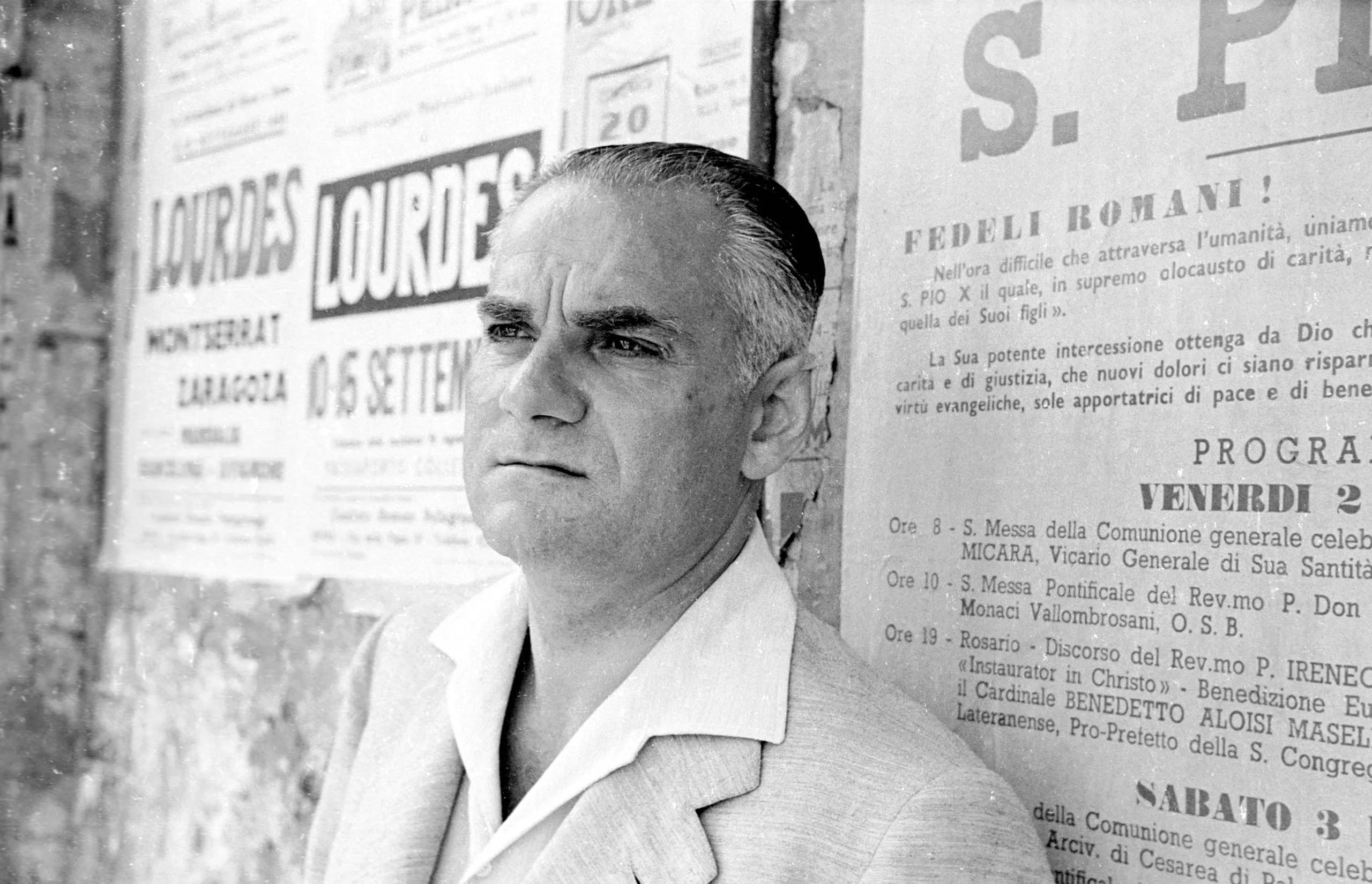 Black and white photograph, man from chest up leaning against a wall papered with Italian and Spanish event posters, soft directional lighting
