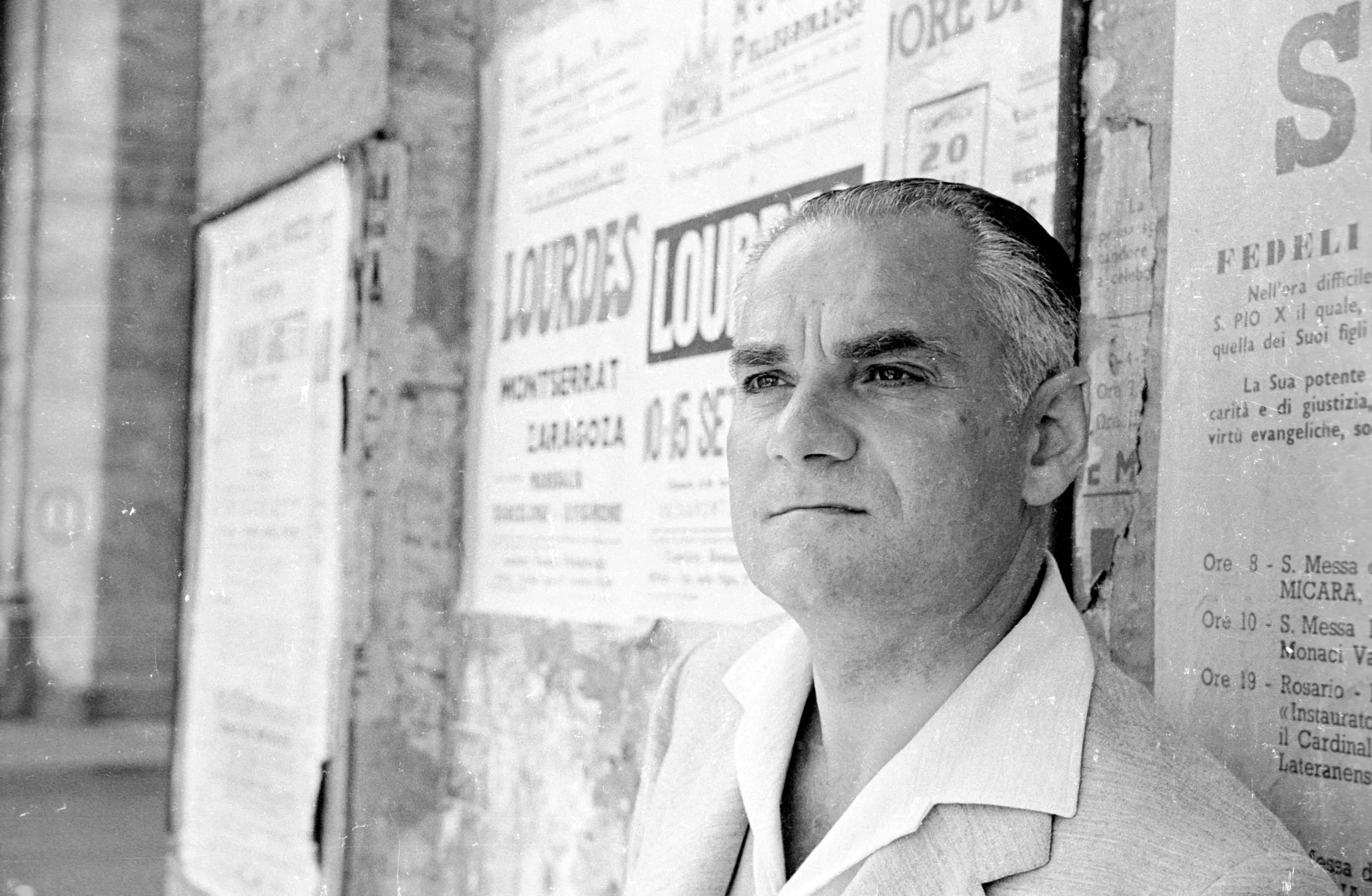 Black and white photograph, chest-up portrait of a middle-aged man leaning against a wall covered in Italian posters, looking off to the right